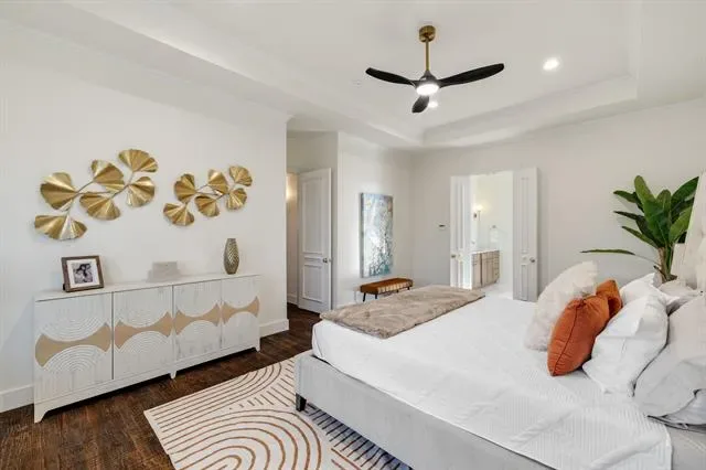 The primary suite serves as a luxurious retreat with a spa-inspired bath and expansive walk-in closet. A guest suite is conveniently located downstairs.