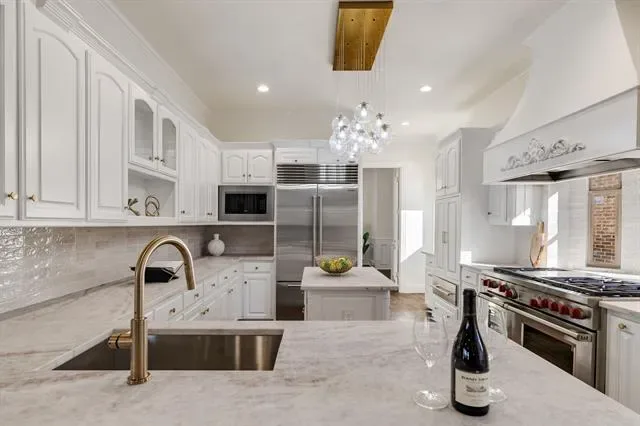 The chef’s kitchen is thoughtfully designed for both daily living and hosting, complete with Taj Mahal quartzite countertops, custom white cabinetry, Sub-Zero refrigeration, Wolf appliances, and an oversized island with seating. The spacious family room is anchored by a striking floor-to-ceiling stone fireplace and flows seamlessly into the kitchen and breakfast area. All 3 living spaces overlook the stunning backyard and pool.