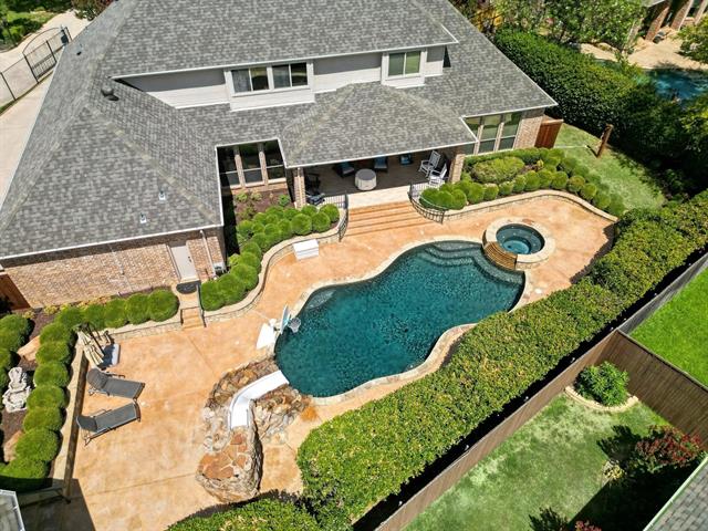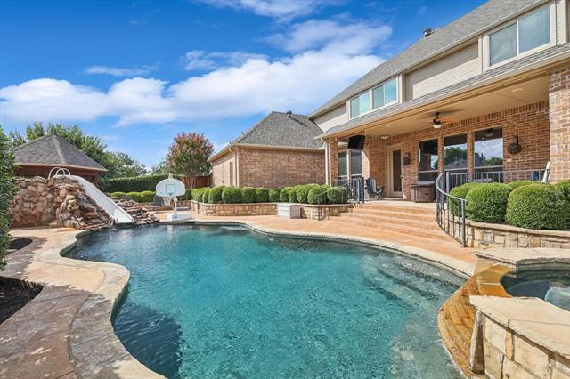 Beautiful , rare custom home in Reatta Place in Colleyville with fantastic curb appeal and a wonderful floorplan that features 4 bedrooms and 4 baths. 3 of them on first floor . Executive study features built-ins and is perfect for working from home. Chefs kitchen was updated in 2020 with double ovens, new cooktop, microwave, dishwasher, and water softener. Enjoy movie night in your home theater with large screen, surround sound projector and reclining seats. Massive Game Room with wet bar. Inviting outdoor space includes saltwater pool, spa, water slide and water feature. Entertain outdoors in the gazebo, bar and cooking area as well as plenty of room for a dining table.2 storage sheds that are hidden behind hedges offer ample room for extra storage. RV hookup with 50 amp. Recent improvements: Roof & gutters July 2024, generator backup panel, water heaters 2016, 2 new AC units 2019, 3rd unit 8-24, new paint 2021, new carpet 2020 & 2021, backsplash 2021, pool pump and heater 2021,2024, new hardware 2021, some lighting replaced 2021, outdoor area-new tile 2021