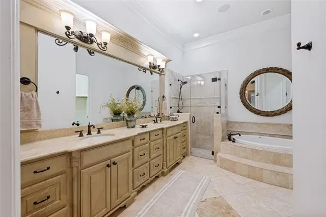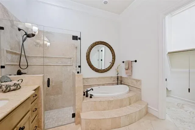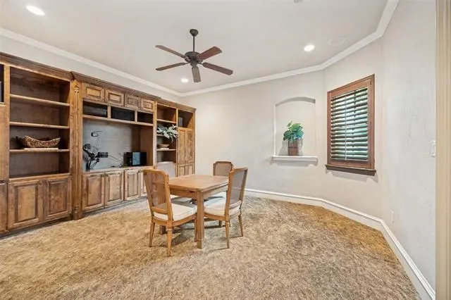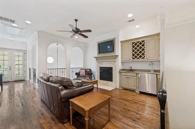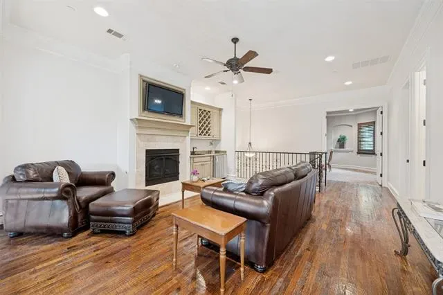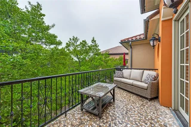 This Mediterranean-style condominium is situated in the heart of Colleyville and features elegant Tuscan-inspired architecture. The home offers high quality finishes, including hand-scraped hardwood floors, granite countertops, and a modern kitchen equipped with stainless steel appliances and a breakfast bar. Throughout the residence, you will find beautiful crown molding, solid core doors, and soaring ceilings. The spacious primary suite is located on the main floor, with an adjoining sitting-room or office area. Upstairs includes two additional bedrooms, two bathrooms, a second living or club room with gas fireplace a wet bar and convenient mini-fridge. The second floor also features a spacious media room. Residents can step outside to enjoy the Colleyville Library and Colleyville City Park or take a short walk to nearby shops and restaurants. Community amenities include a private pool, clubhouse, and fitness center conveniently located just across the street. This property is ideal for those seeking a low-maintenance, lock-and-leave lifestyle.