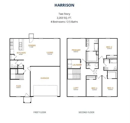 The Harrison Plan from our Liberty Series offers a perfect blend of comfort, practicality, and exceptional value. This 2-story home features 4 bedrooms, 2.5 bathrooms, a 2-car garage, and 2,203 square feet of thoughtfully designed living space. As you step inside, you’ll pass the versatile flex room before reaching the staircase to the upper level, a convenient closet, and a half bathroom. The heart of the home is the open kitchen and living area, complete with a central island, a dining area, and a spacious family room — perfect for entertaining or relaxing with loved ones. Upstairs, the private primary suite awaits, featuring an en suite bathroom. Three additional bedrooms, one more full bathroom, a loft area for additional living space, and a convenient laundry room complete the upper level.
