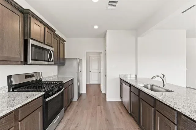 The two-story Cypress boasts four bedrooms, two-and-a-half bathrooms and an attached two-car garage. The kitchen features wood cabinets, granite countertops and stainless-steel appliances, with an adjacent dining room perfect for family meals. With a seamless flow between the kitchen, dining and family rooms, the spacious living areas offer room for entertaining, from football watch parties to cozy movie nights. The downstairs master suite includes a bedroom, bathroom and walk-in closet. Upstairs, the secondary bedrooms each have walk-in closets, providing additional storage. Other storage options, including a spacious pantry, numerous cabinets and linen closets, are also spread throughout the home for extra storage and organization.
