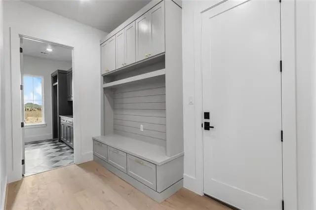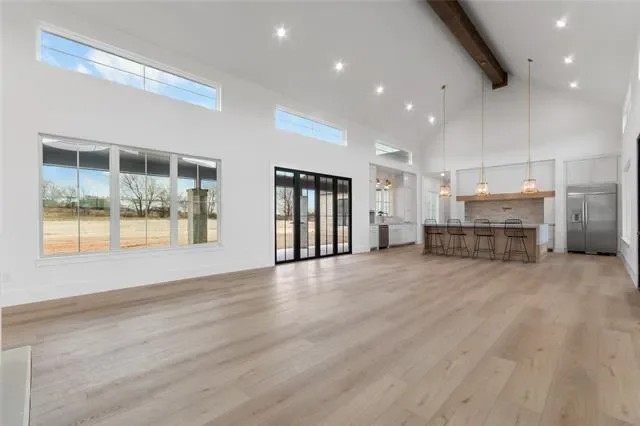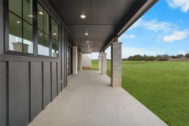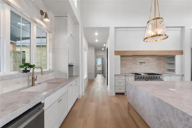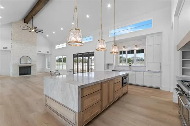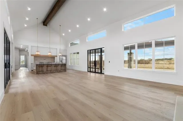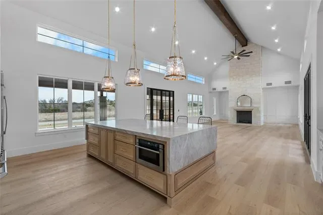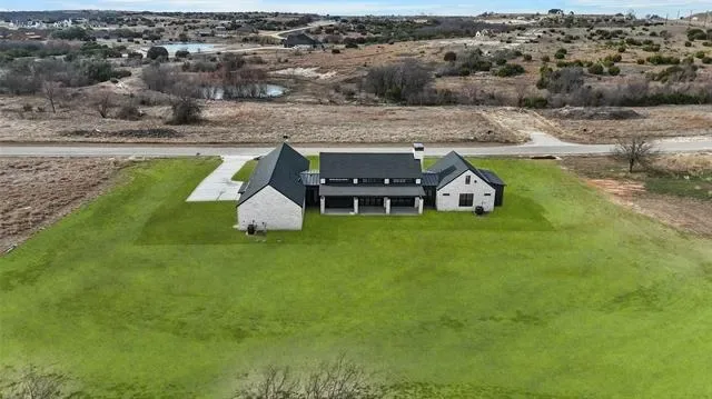 Nestled on a serene 2-acre homesite in the gated community of Terraza Hills, this exceptional new construction by Arteaga Homes showcases meticulous craftsmanship, thoughtful design, and timeless transitional Hill Country style. Perched among tiered hillsides, the property offers sweeping, panoramic views and a peaceful, elevated setting that feels both private and inspiring. The striking exterior reflects the builder’s dedication to quality, featuring handcrafted stonework, clean architectural lines, and bold modern black windows and accents that create a refined yet approachable aesthetic. Inside, warm wood tones, custom finishes, and sun-filled spaces create a beautifully layered and inviting atmosphere. The open living area is anchored by a dramatic floor-to-ceiling stone fireplace, walls of windows, and a statement exposed wood beam that highlights the home’s artisanal character. The chef-inspired kitchen continues this standard of excellence, offering a gas range with pot filler, abundant custom cabinetry, and a large center island designed for both entertaining and everyday living. The primary suite is a true sanctuary, distinguished by its own exposed wood beam and striking iron sliding barn doors that open to a spa-like bath. The en-suite features double vanities, a freestanding soaking tub, and an oversized walk-in shower with dual shower heads and a rainfall feature—combining luxury with purposeful design. A generously sized back patio extends the home’s craftsmanship outdoors, providing a perfect space for dining, gathering, or enjoying quiet evenings and expansive views. Ideally located just seventeen miles south of Fort Worth between Fort Worth and Granbury, this home delivers tranquil hillside living with convenient access to shopping, dining, and city amenities—an extraordinary blend of artistry, quality, and lifestyle in a premier gated community.