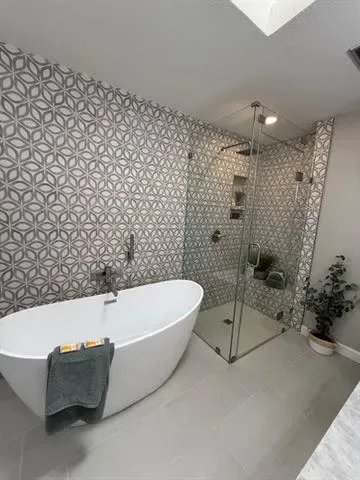 tile flooring in the bathrooms. The new custom kitchen features white shaker, solid wood cabinets, large peninsula, new appliances, and a large walk-in pantry. The primary bath features stunning custom 3-dimensional tiled walk-in shower with rainfall shower head, and a separate freestanding tub. Primary suite includes two walk-in closets and a large linen closet. In addition, there is a custom remodeled guest bath. This home is situated on a large .4-acre lot with lots of trees, new landscaping, with greenhouse, storage shed, irrigation system, RV parking with electric connections,
