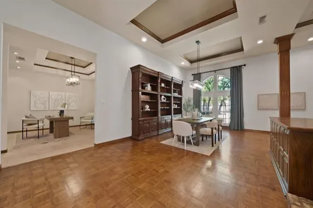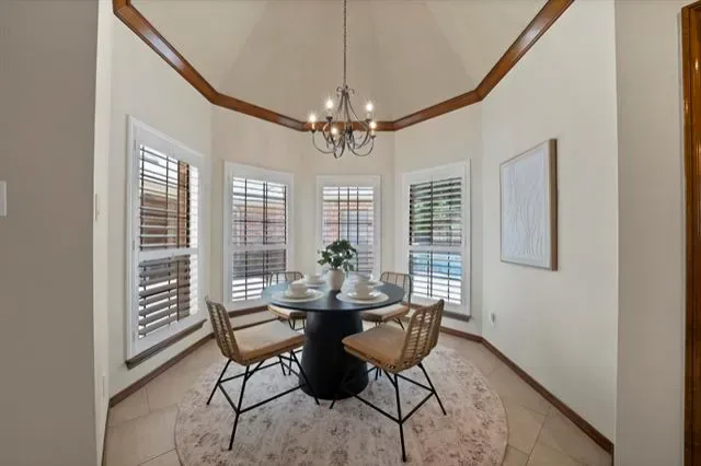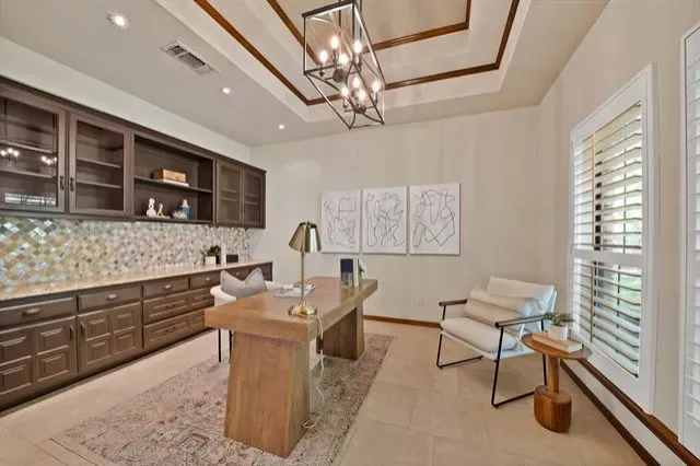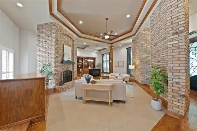 Inside, 12 and 15 foot ceilings create an open, airy feel, complemented by a floor-to-ceiling brick fireplace and distinctive brick accent walls. The flexible floorplan includes 4 bedrooms, 3 full bathrooms, 2 dining areas, and a dedicated office. Rich wood finishes, plantation shutters, and custom details reflect the quality of a thoughtfully designed home.