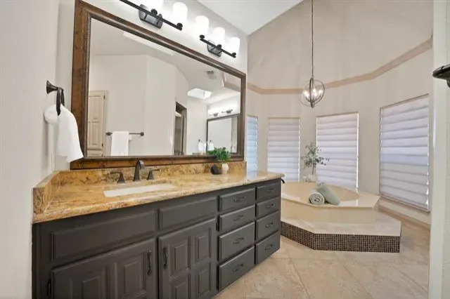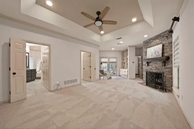 The spacious primary suite features its own fireplace, sitting area or library space, and a romantic ensuite bath, with direct access to the patio and pool.