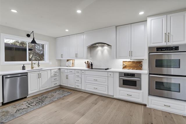 The bright white kitchen features custom cabinetry and a clean, modern design, along with a large laundry and pantry room. A thoughtfully designed transition space between the kitchen and formal dining room includes custom cabinetry, a secondary sink, and a built in beverage refrigerator, ideal for entertaining.