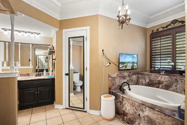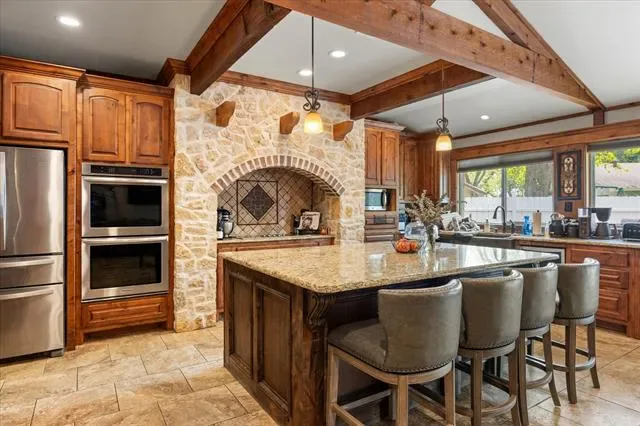 Inside, the open floor plan is anchored by a stunning kitchen featuring granite countertops, a large island, a built-in wine cooler, and a dry bar—ideal for entertaining. The oversized primary suite is a true retreat, boasting cathedral ceilings, a jetted tub, and a custom closet system. Two additional bedrooms and a guest suite provide plenty of room for family or visitors.