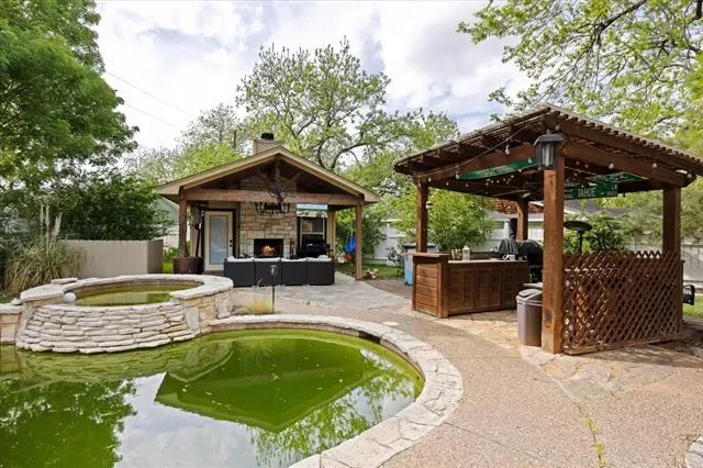 The backyard is a staycation dream, featuring pool, an outdoor kitchen, and a covered living center. Features include a 180 sq. ft. pool house, a golf cart garage, and a circular driveway for ample parking.