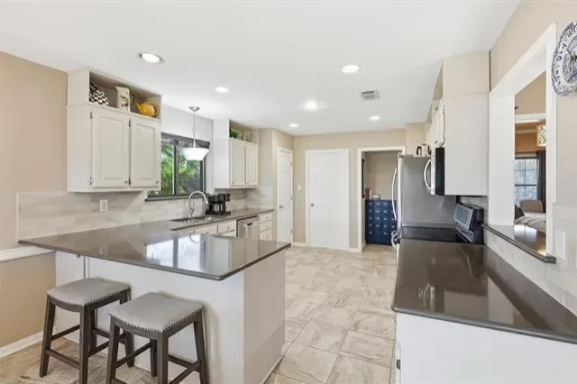 5107 LARGO DR GORGEOUS One of a Kind HOME that backs up to the DeCordova Bend Golf Course Ample PARKING on a long LIT driveway to the 955 sqft THREE CAR Garage plus GOLF Cart Garage This BEAUTY has a LIVING Area UPSTAIRS and DOWNSTAIRS Downstairs Living has Wood-like FLOORS, a FIREPLACE with Shelves on either side PLUS WINDOWS all along the COURSE side Two DINING AREAS off each end of the RECENTLY UPDATED KITCHEN with Pantry and STORAGE Galore LARGE PRIMARY down with NEW Bath complete with SOAKER TUB and Giant SHOWER and DOOR to the PATIO LIVING, GAMING or BEDROOM Upstairs with Second Story Screened In PATIO access and a STORAGE Room of that Room for Everything Else Two additional Bedrooms, ONE with a Built-in Desk and the other with Patio Access and a NEW BATH between them WINDOWS have pull down TOUCH SHADES and BLINDS plus dark SOLAR SCREENS CANNED Lighting THRU-OUT All Flooring has been REDONE THIS IS A MUST-SEE for ANYONE that NEEDS QUALITY and SPACE