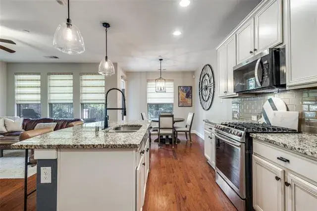 cabinets and desk station in kitchen, granite countertops, hardwood flooring, eat in kitchen island, designer lighting, walk in closets, tankless water heater, fire sprinklers, and keyless garage entry. While conveniently located, the back yard offers a bit of peace with an adjacent park and greenbelt, covered porch and extended patio.