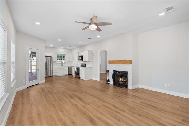 REDUCED PRICE! Beautifully updated single-story brick duplex offering effortless living in a prime location! Nestled in a quiet, well-kept neighborhood close to schools, shopping, and dining, this 3-bedroom, 2-bath home blends modern comfort with timeless charm. Step inside to an inviting open floor plan filled with natural light and durable luxury vinyl plank flooring throughout. The spacious living room features a striking stone wood-burning fireplace, recessed lighting, and stylish updated fixtures—creating the perfect setting for relaxing or entertaining. The modern kitchen will delight any home chef with its quartz countertops, sleek updated range, abundant cabinetry, and convenient layout that flows seamlessly into the casual dining area. The private primary suite offers a serene retreat with a large walk-in shower, elegant finishes, and generous closet space. Two additional bedrooms and a full guest bath provide versatility for family, guests, or a home office. Step out back to enjoy your expansive private patio—ideal for outdoor dining and gatherings. A full wooden fence adds privacy, and rear alley access leads to covered parking plus additional parking space. Stylish, move-in ready, and thoughtfully updated—this home is the perfect combination of comfort and convenience. Don’t wait to see it—schedule your showing today!