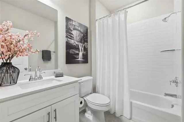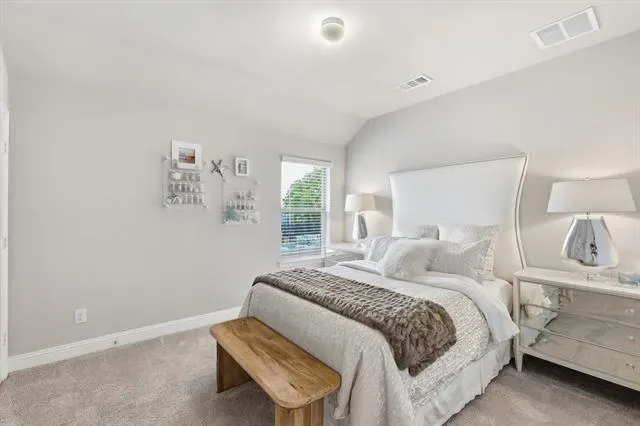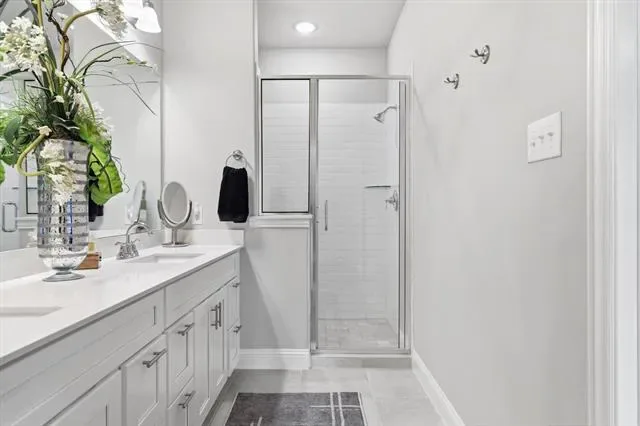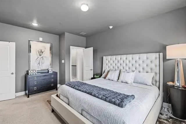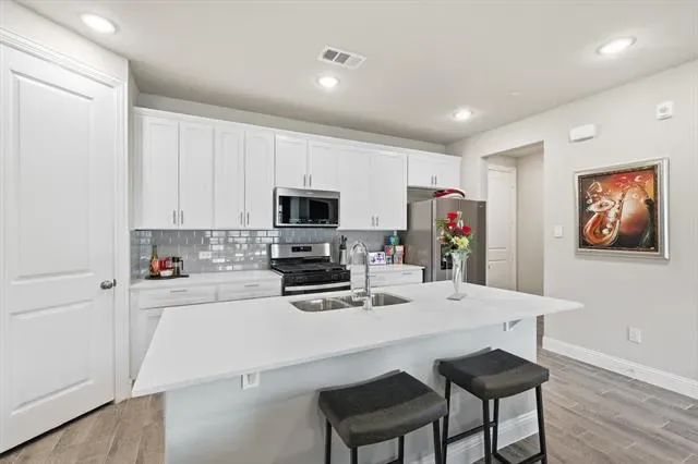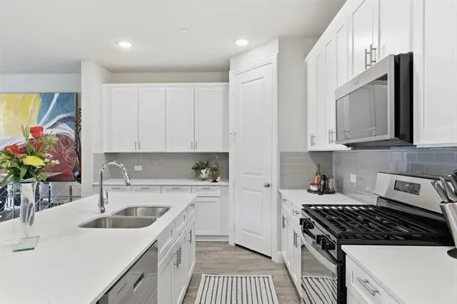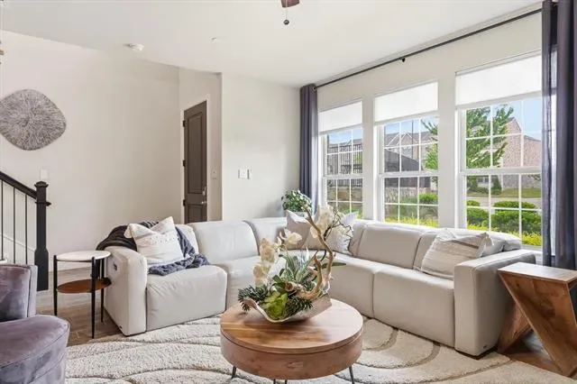This home features a Bright Open-Concept Living Room with a Spacious and Airy Layout, Generous Wall Width, and Large Rectangular Walls ideal for Mounted Installations or Decorative Treatments. A Centered Ceiling Fan, Large Windows, and Power Blinds provide Functional Airflow, Abundant Natural Light, and privacy, creating a Modern Architectural Feel with High Ceilings, Open Floor Space, and a Neutral Color Palette that supports Flexible Layout and Contemporary Design Styling. The Large Dining Area offers ample space for a Large Dining Table, Buffet, and Dry Bar, making it perfect for Entertaining and Everyday Dining. The Cook’s Kitchen showcases Modern White Shaker-Style Cabinetry, Light-Toned Quartz Countertops, a Spacious Center Island with Breakfast Bar, Soft Gray Subway Tile Backsplash, Recessed Lighting, and Upgraded Wood-Look Tile Flooring for Durability and Warmth. A Full-Height Pantry and Multiple Work Zones enhance Functionality and Flow, seamlessly connecting the Living and Dining Areas for Effortless Entertaining. The Primary Bedroom offers a Spacious Layout, Soft Neutral Color Palette, Accent Wall Finish, Large Windows, and Full-Length Drapery, creating a Calm and Private Retreat with Natural Light and Modern Architectural Lines. The Luxurious Primary Bathroom features a Raised Mirrored Vanity, Dual Sinks, Quartz Countertops, Designer Lighting, Upgraded Tile Flooring, and a Large Tile Shower. An Extra-Large 2-Car Garage with Alley Access, Epoxy Floors, and Abundant Storage Space adds convenience, while the HOA Covers Roof Maintenance and Replacement, providing Additional Value and Peace of Mind.