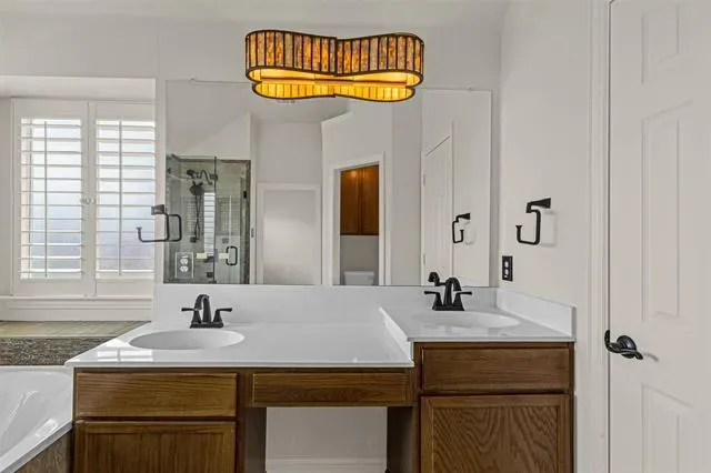 Nestled on a prime corner lot within the exclusive gated community of Fountain Park, this stunning two-story residence offers the perfect blend of elegance and central convenience. Located in the heart of Euless with easy access to Highway 360 and DFW Airport, the home greets you with a grand circular entry, soaring high ceilings, and sophisticated plantation shutters throughout. The functional floor plan is designed for both work and play, featuring a private downstairs office, formal living and dining rooms, and a total of three spacious living areas. The heart of the home is the island kitchen, complete with stainless steel appliances (refrigerator included) and a sunny breakfast nook that leads through sliding glass doors to the backyard. Upstairs, you’ll find a massive loft and all four bedrooms, including a luxurious primary suite boasting a jetted tub, dual sinks, and a separate shower with a rain head fixture. Decorative lighting, fresh landscaping, and a comprehensive sprinkler system enhance the property’s curb appeal, while practical touches like rain gutters and a spacious utility room with built-in shelving provide everyday ease. Residents of Fountain Park also enjoy premium community amenities including a pool, park, pond and more. This home is being sold as-is, offering a fantastic opportunity to secure a substantial footprint in a highly sought-after neighborhood.