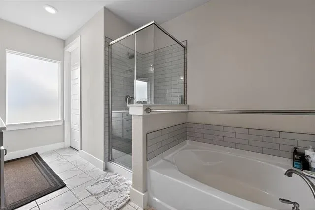The gourmet kitchen features a large island with seating, sleek countertops, stainless steel appliances, subway tile backsplash, and ample cabinetry, making it both functional and elegant. The spacious primary suite offers a relaxing retreat with two separate closets, providing excellent storage and convenience.