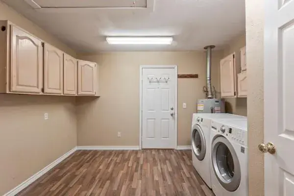 The kitchen features abundant cabinetry, an updated subway tile backsplash, gas cooktop, built-in oven, and plentiful counter space ideal for everyday cooking or entertaining. Wet areas, including bathrooms, kitchen, and laundry room, feature luxury vinyl plank and vinyl flooring for durability and style.