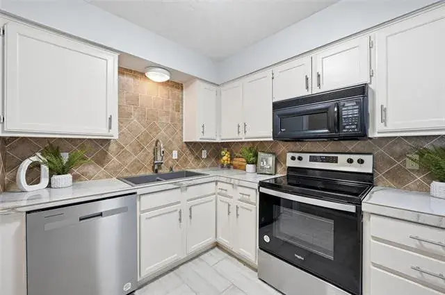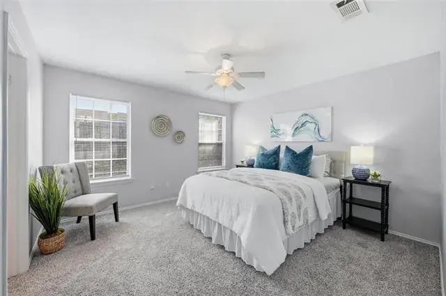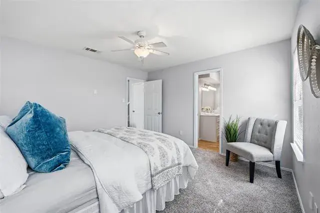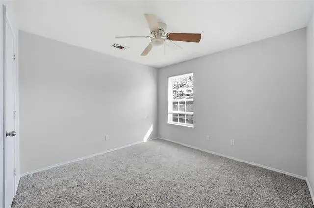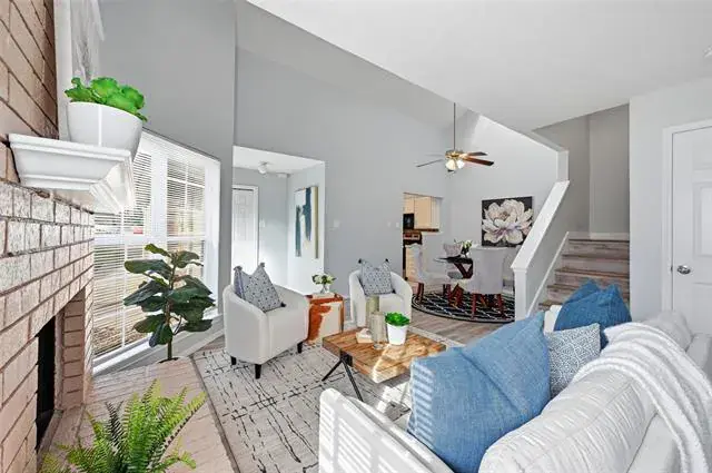 LOCATION, LOCATION, LOCATION! Charming MOVE-IN-READY 3-bedroom, 2-full bath half-duplex conveniently located near schools, shopping, dining, entertainment, major freeways, and 6 minutes from DFW International Airport. Step inside to a light-filled living room featuring vaulted ceilings, skylight, and a cozy wood-burning fireplace that creates a warm and spacious atmosphere. The functional floorplan offers a desirable primary suite on the main level, with two secondary bedrooms and a full bath upstairs for added privacy. Water heater has been replaced, kitchen appliances, flooring, and roof installed in 2023, NEW fresh interior paint throughout, and BRAND NEW carpet installed in all bedrooms. Concrete back patio and fenced backyard. This adorable home is ready for you to come home and make it yours!