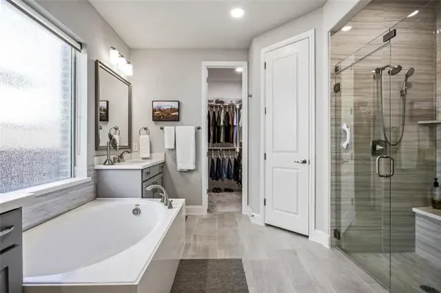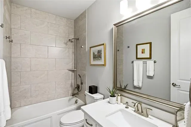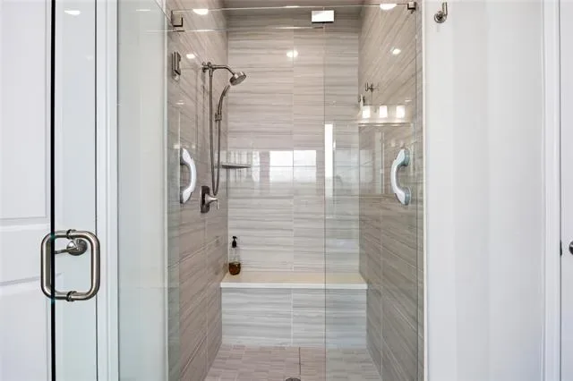 All bedrooms offer double-shelf closets, with additional storage in utility spaces. Bathrooms include upgraded dimmable vanity lighting, upgraded Kohler showerheads and wand setups, tile-to-ceiling surrounds, in-counter soap dispensers, and a custom glass enclosure in the second bathroom.