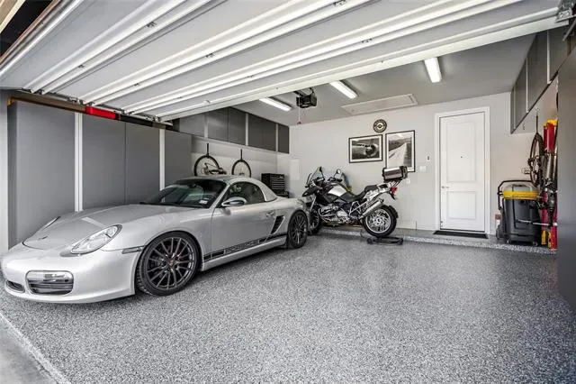 The garage impresses with a high-end epoxy floor, custom floor-to-ceiling cabinets, ceiling storage, bright LED lighting, and an extra hose bib.
