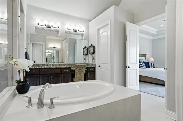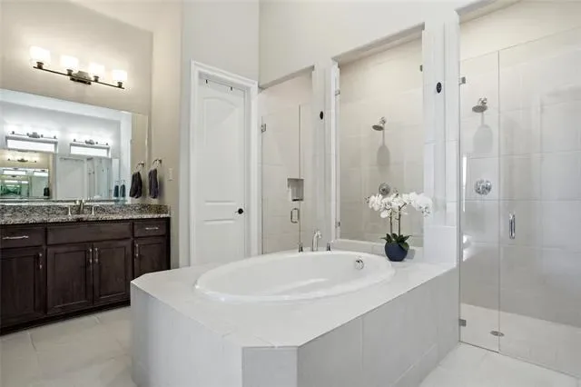 The main-floor primary suite offers a peaceful retreat with a spa-like bath, soaking tub, separate shower, and a spacious walk-in closet.