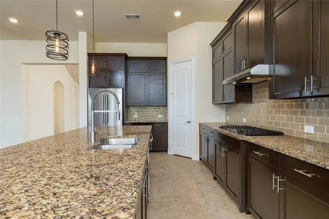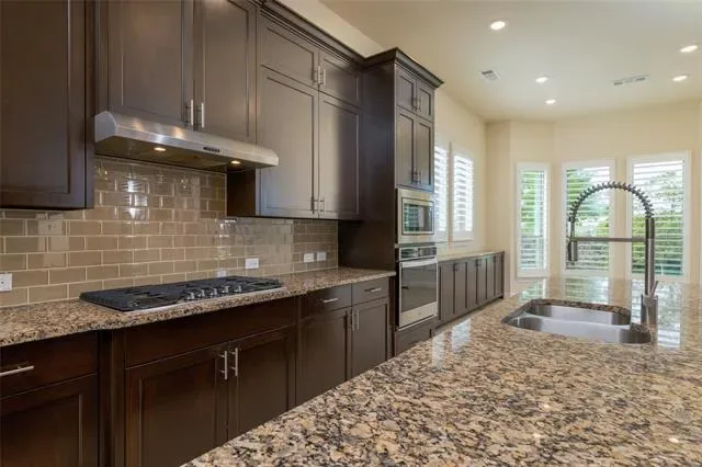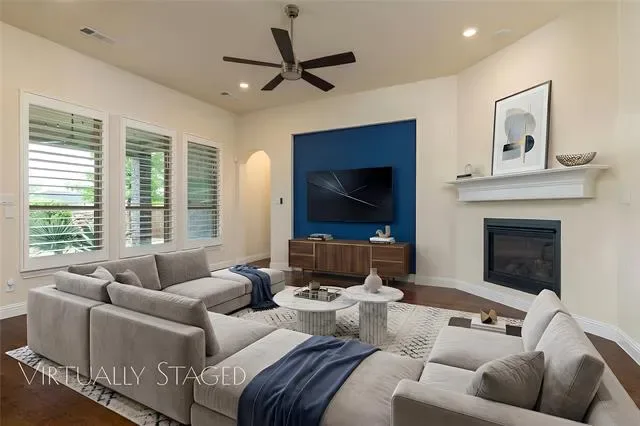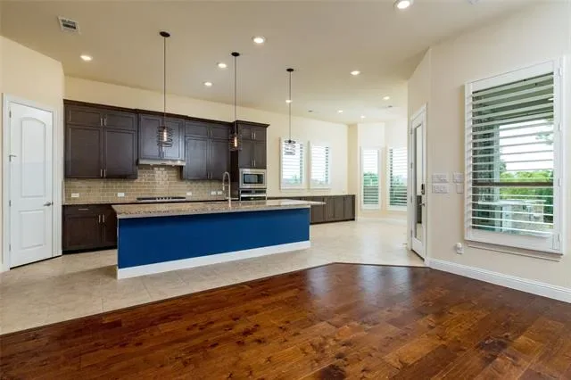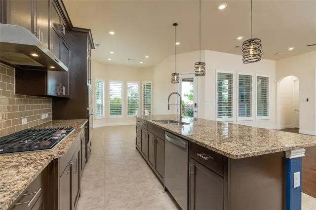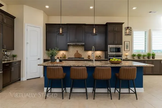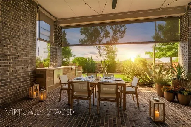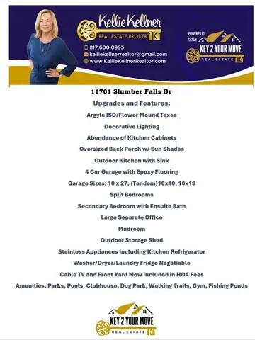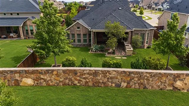 Argyle ISD Flower Mound Taxes! Gorgeous front porch welcomes you into this beautifully designed home. The oversized family room opens to the kitchen, featuring a large island, abundant cabinetry, and a walk-in pantry. Plantation shutters and decorative lighting throughout. Beautifully landscaped back yard and oversized patio with outdoor kitchen and drop-down patio screens. The primary suite offers a vaulted ceiling, bowed window, dual vanities, a garden tub, separate shower, and a large walk-in closet. A secondary bedroom includes its own private bath with a shower. Two additional split bedrooms provide privacy and flexibility. A large separate office and flex room included. Enjoy the convenience of a mudroom upon entry from the garage, along with a custom 4-car garage with epoxy flooring, and outdoor shed. Located within walking distance to schools. Community amenities include pools, parks, fitness center, clubhouse, fishing ponds, dog park, and miles of bike and walking trails. Direct TV and front yard mowing included in HOA. Photos Virtually Staged.