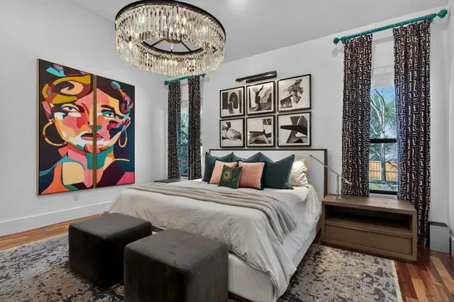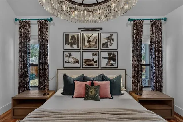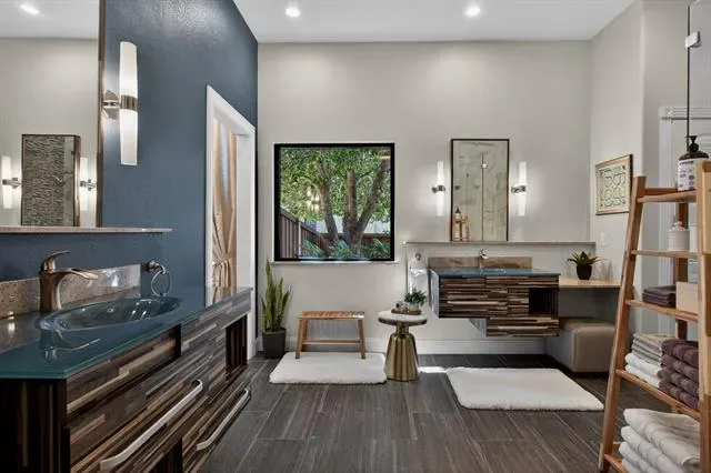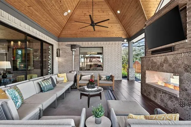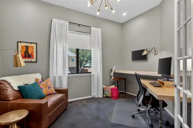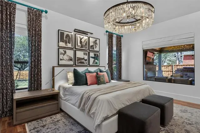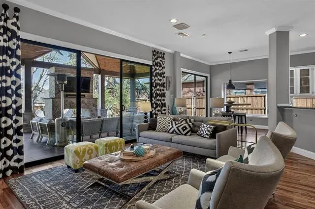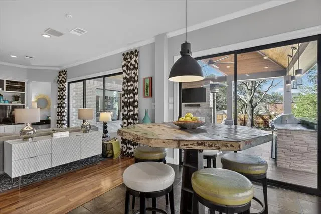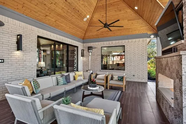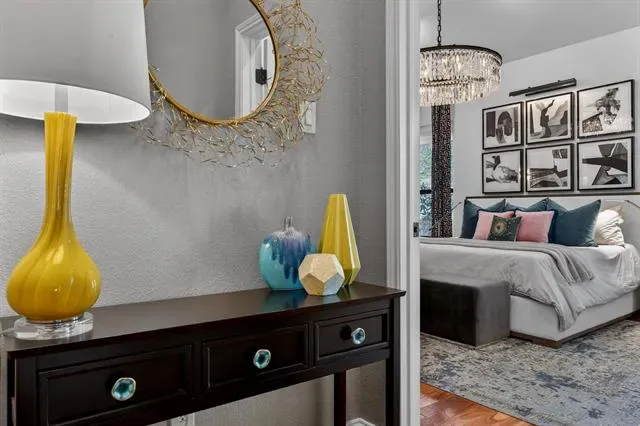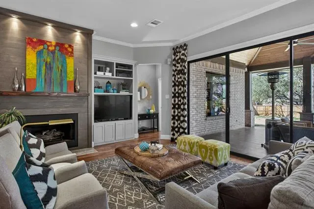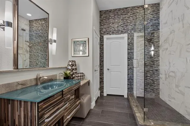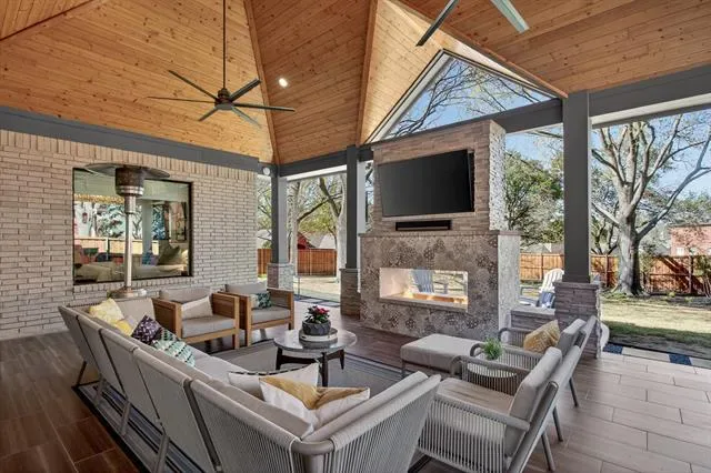 A true masterclass in design &' custom updates, where every finish is thoughtfully curated &' each detail meticulously executed. Impeccable curb appeal &' a striking oversized steel &' leaded glass front door create a grand first impression, welcoming you to this corner-lot luxury residence in the prestigious Cedar Bluff community, one of Flower Mound’s most sought-after enclaves, celebrated for exceptional schools. The primary suite is a sanctuary of stillness, with acacia wood floors, wrapped in Museum Gray walls, restoration hardware striking chandelier, oversized windows &' en-suite spa bath with dual vanities adorned with glass countertops, designer tile, large picture window &' 2 walk-in closets with custom built-ins. A secondary bed has been transformed into an exquisite dressing room with a Container Store custom cabinetry system &' remains ready to become a nursery, office or guest space. The front bed glows with natural light through an arched window, complemented by a meticulously designed custom closet &' sliding door. Room with French doors is equipped with built-ins &' specialized carpeting. Main living impresses with a designer fir wood fireplace &' a seamless connection to the outdoors through the 8×12 Milgard floor-to-ceiling sliding glass doors &' windows that dissolves the boundary between inside &' out. Kitchen with granite counters, mosaic backsplash, stainless appliances &' a movable West Elm island. A Texas Custom Patios outdoor 29×19 living center unfolds beneath a dramatic pine cathedral-vaulted ceiling, recessed lighting, dual fans, gas fireplace, SONOS sound, dimmable ambiance, &' built-in RCS kitchen with grill, two-burner cooktop, mini-fridge, &' storage. Beyond the see-through fireplace, a 2nd outdoor area offers a quiet open-air setting for morning coffee &' peaceful evenings under the stars with expansive yard beyond. 4 homes away from Shadow Ridge Park, close to Lakeside, Community Activity Center &' less than a mile from Kroger, Starbucks &' more.