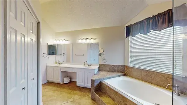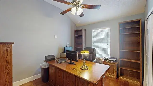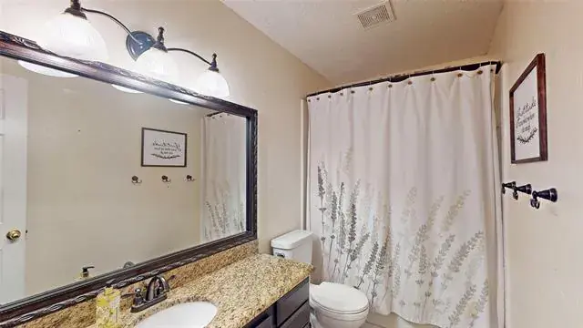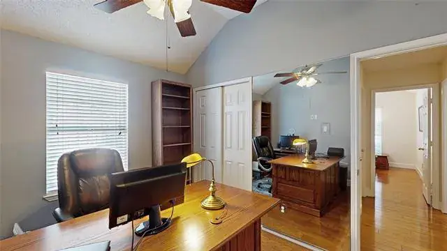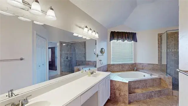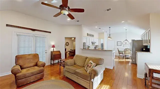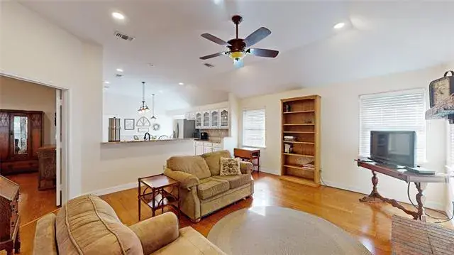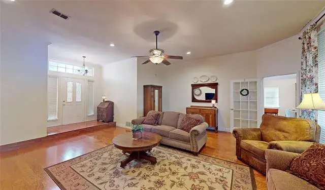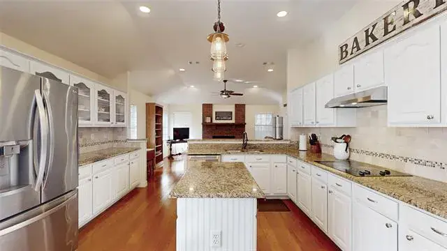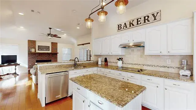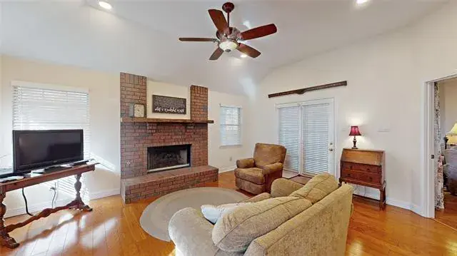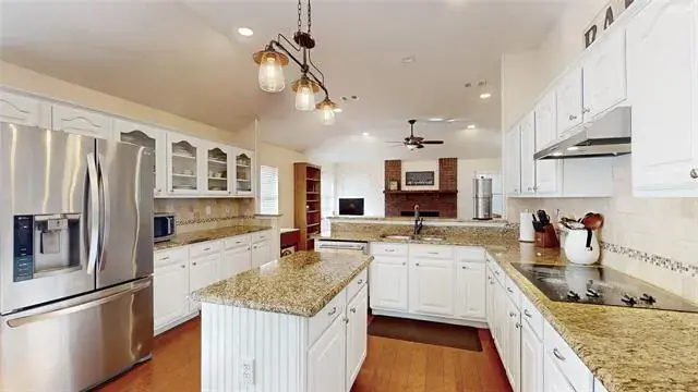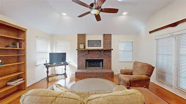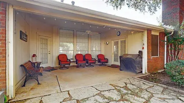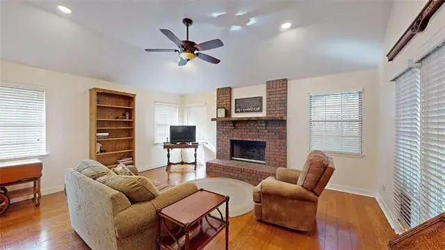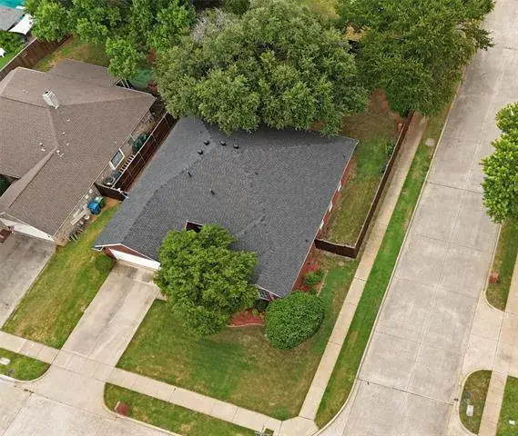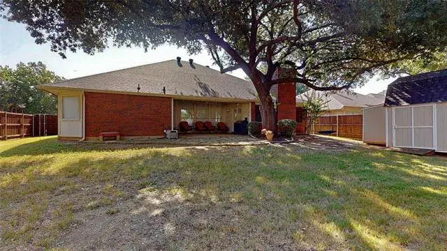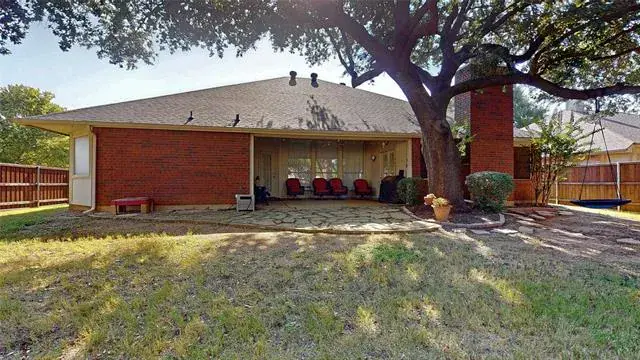 Meticulously maintained single-story with beautiful brick elevation and mature trees! Terrific location in an established Flower Mound community, just walking distance to Marcus HS! Inside you will find 4 bedrooms, 2 full baths, a second living space with cozy fireplace just off the kitchen, and 2-car garage! Upgrades and amenities include gorgeous hardwood flooring throughout main living areas, an abundance of natural lighting throughout, new roof and HVAC in September 2024, neutral paint tones, split secondary bedrooms for added privacy, extensive crown molding, upgraded lighting fixtures, huge living space at the heart of the home, whole home water purification system, and MORE! Spacious kitchen boasts granite countertops with a tumbled stone backsplash, an abundance of bright white cabinetry, stainless appliances including double ovens, an electric cooktop, and cozy breakfast nook. Primary retreat secluded at the rear of the home offers a luxurious ensuite with garden tub, frameless shower, and large walk-in closet with built-ins. Large private backyard with mature shade trees is complete with an expansive covered patio area perfect for entertaining and storage shed!