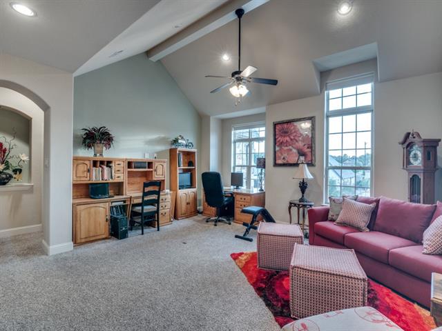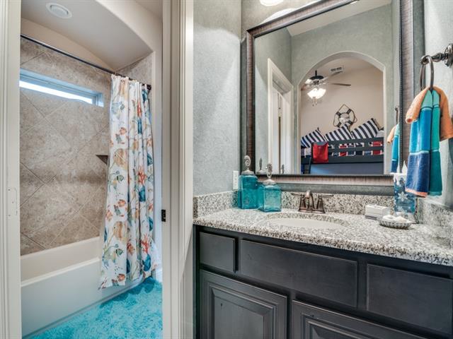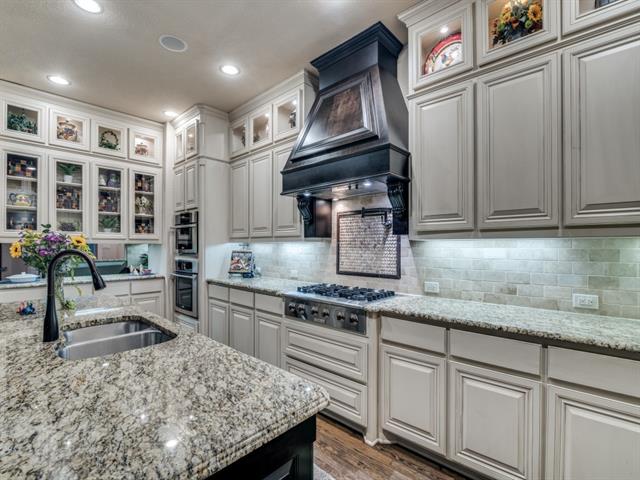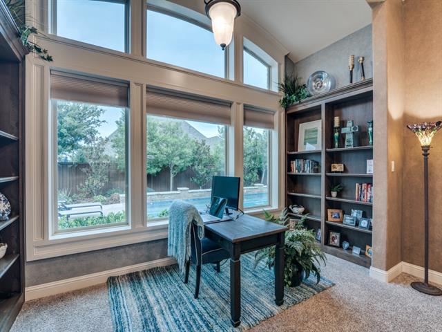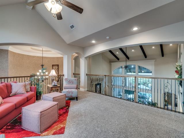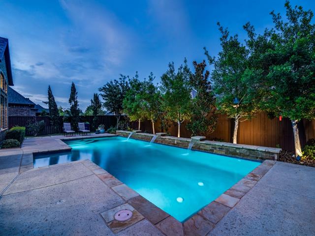 Gorgeous former model home lushly landscaped & loaded with upgrades! This 4 Bedroom, 4 Bath, open plan home is perfect for entertaining! Genuine hardwood floors! Dramatic curved staircase! Art niches! Custom millwork & built-ins! Large Dining Room features a coffered ceiling & brick accent wall! Office-Study off the front Foyer. Great Room has a soaring beamed Cathedral ceiling & stone fireplace with window views out to pool & patio. The open Kitchen is the heart of this home featuring a large center island with built-in dining, granite counters, architectural vent hood, pot-filler, glass-front cabinets, walk-in pantry, SS appliances including gas cooktop & more! The adjacent wet bar area is ready for all your soirees! Primary Bedroom conveniently located downstairs with a sitting area & luxe ensuite bath! Loft-Living upstairs along with 3 more Bedrooms – one features French doors opening to a Juliette balcony! Game & Media Rooms are both downstairs where family & guests can easily flow out to the pool & patio! The beautifully landscaped backyard is ready for summer fun with sparkling pool, outdoor kitchen-living with SS grill, stone fireplace & more! Big Laundry Room with ample storage & built-ins! 3 car tandem garage! Beloved FM schools! Fabulous location near restaurants & shopping! Minutes to DFW Airport! This is HOME!