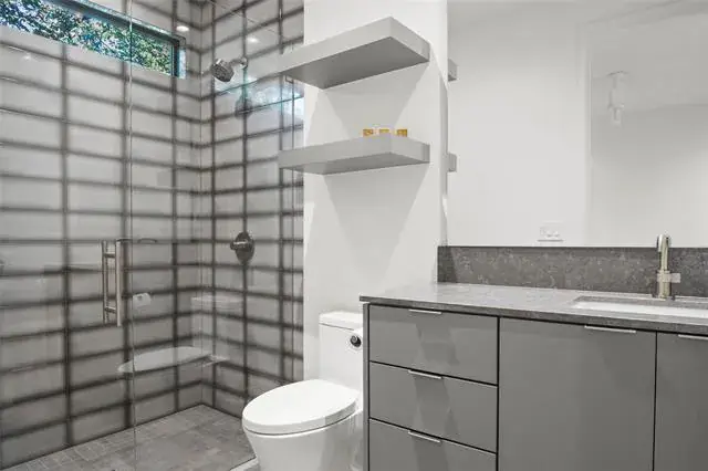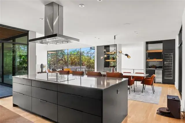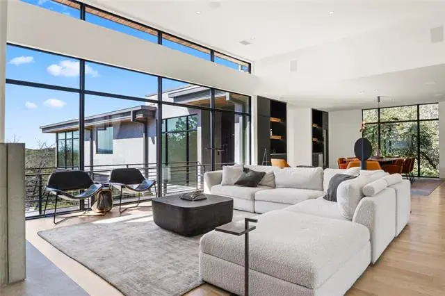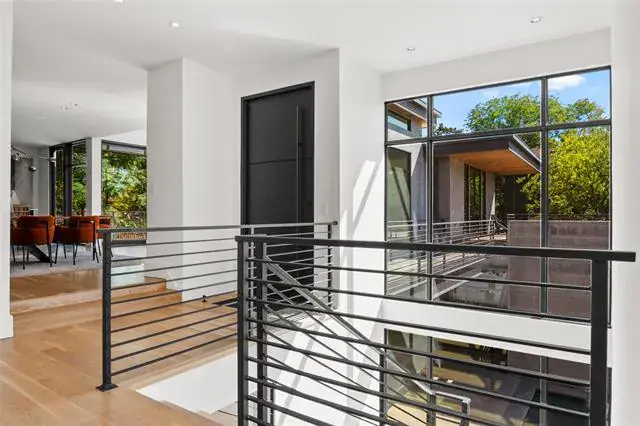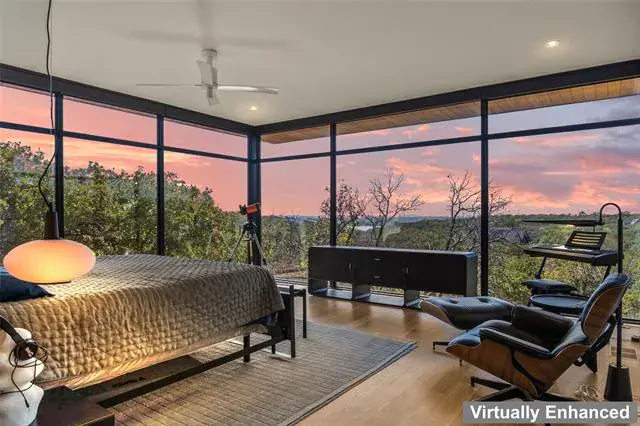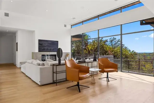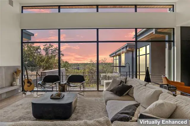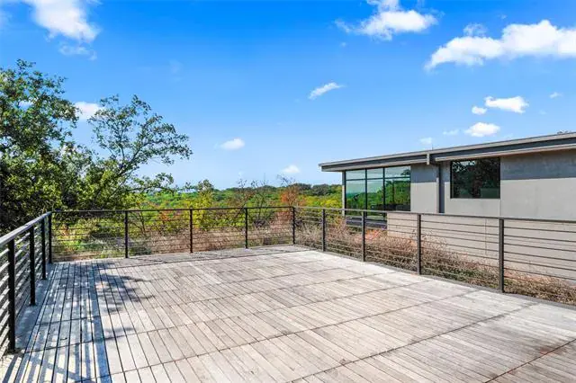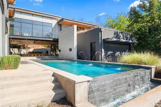 Modern luxury custom home by RGD+B with stunning views! Expansive glass walls fill the space with natural light, giving the feeling of living in the treetops. The open living area offers sunset views, an electric fireplace, and flows into the dining and sleek kitchen with high-end cabinets, stainless appliances, oversized fridge, and large island with cooktop and seating. Light wood floors, tall ceilings, and built-in speakers add elegance. The primary suite overlooks Grapevine Lake with electric shades and a spa-like bath featuring dual sinks, glass shower, and large closet. Office and workout room or 5th bedroom open to balconies. Downstairs includes two bedrooms with private baths and a game room with sliding doors to the heated saltwater infinity pool, waterfall, and covered patio with outdoor kitchen and 4 hole putting green. Guest suite has private entry and bath. Oversized garage with great storage. A must see, check out the 3D tour!