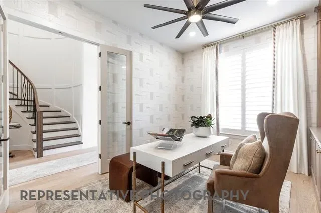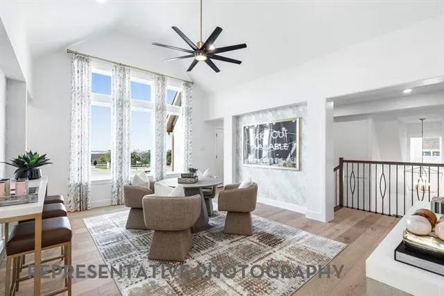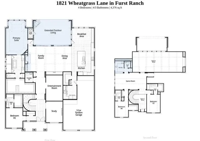 4 beds, 4 baths, 3 powder baths. Downstairs includes secondary bedroom with private bath, entertainment room, study, dining area, breakfast area. Upstairs includes 2 bedrooms with private baths, game room with wet bar and powder bath. Upgrades include extended outdoor living and extended primary suite. 3 car tandem garage.