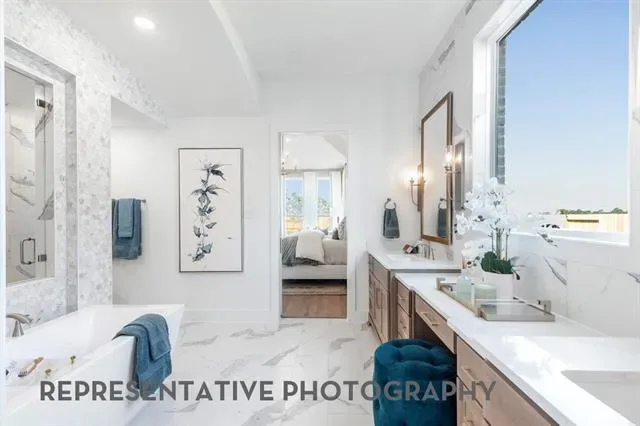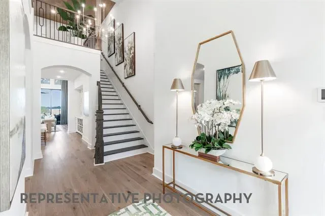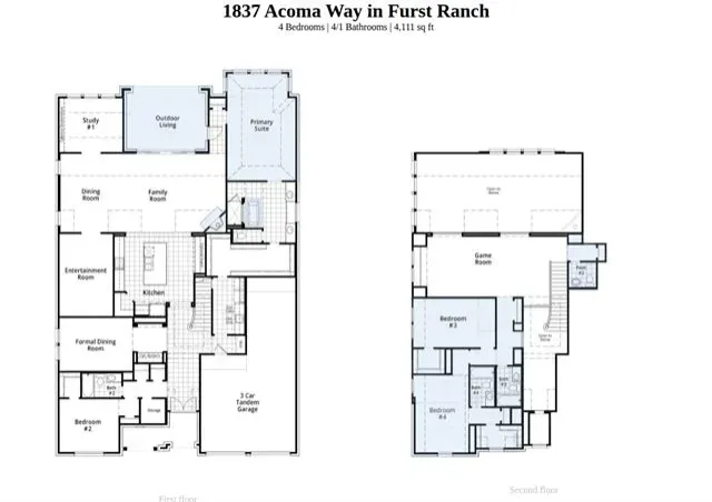 4 beds, 4 baths, 1 powder bath. Downstairs includes secondary bedroom, formal dining room and entertainment room. Upstairs includes 2 bedrooms with private baths, game room and powder bath. Upgrades include extended outdoor living and extended primary bedroom. 3 car tandem garage.