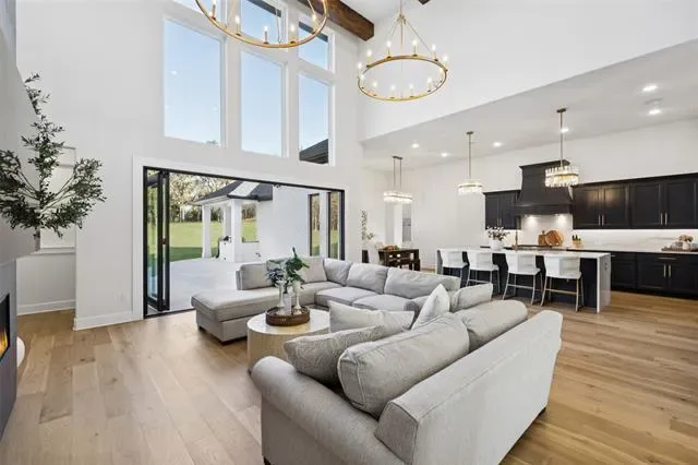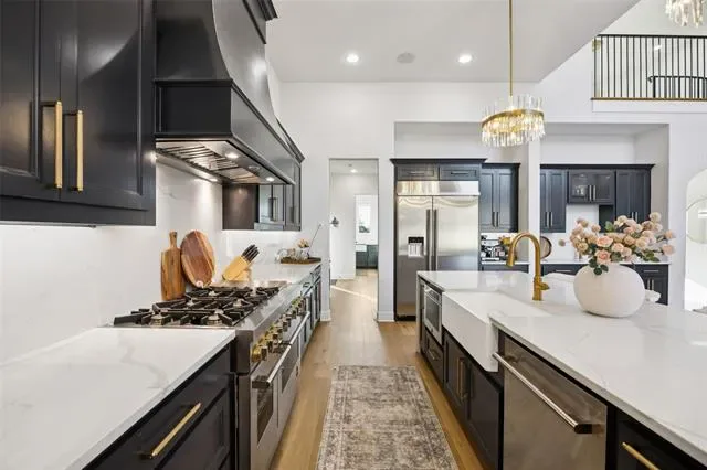 Experience an extraordinary level of design &' livability in this custom-built estate perfectly crafted for multi-generational living. Nestled on a serene, tree-lined 0.69-acre lot adorned w-native post oaks, manicured landscaping &' elegant Taylor &' pom-pom junipers. A grand porte-cochere &' motor court set the stage for a dramatic entrance through custom double iron doors, opening to a bright, open floor plan filled w-natural light. Great room impresses w-dual designer chandeliers, a striking linear FP soaring to 20 ft &' seamless flow into the gourmet kitchen. Every culinary detail has been considered, from farmhouse sinks in both kitchens &' the laundry room to commercial-grade vent systems, custom hood design + a dedicated prep kitchen ideal for entertaining. Each of the 5 ensuite bedrooms offers elevated comfort, featuring WI showers + vessel sinks. Two secondary suites on the 1st floor make this home ideal for multi-generational living, while powder baths on both levels add convenience. Luxurious primary suite features LED backlit mirrors, a spa-inspired bath &' pre-wiring for remote-controlled blinds. Designed for connection &' entertainment, the home includes a fully equipped media rm w-7.1 surround sound, built-in speakers in the kitchen &' covered patio + an outdoor grill perfect for alfresco dining. Step onto the temperature-controlled upstairs balcony to enjoy peaceful sunset views. Technology &' comfort go hand in hand w-smart-home automation controlling lighting, HVAC, irrigation &' surveillance. Every room is equipped w-Ethernet &' Hi-Lo connections, volume control ports + a security system w-multiple keypad stations. Additional highlights include an EV car charger in the garage + beautifully curated outdoor lighting to accentuate the architecture. This exceptional residence stands among Flower Mound’s most distinguished estates, crafted for those who expect nothing less than perfection.
