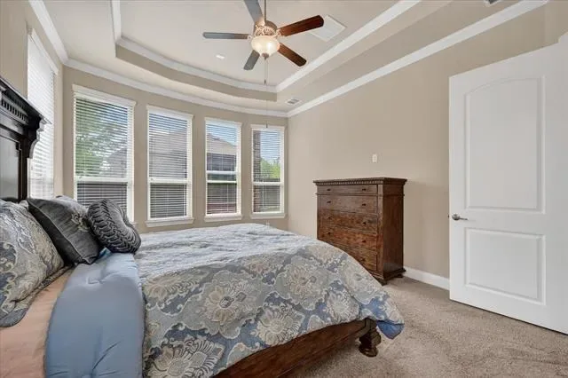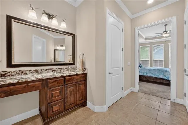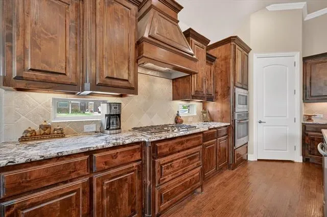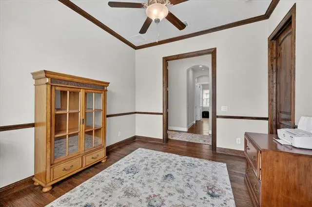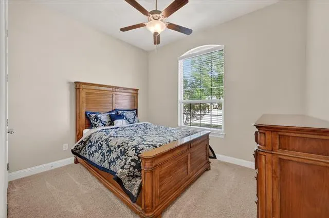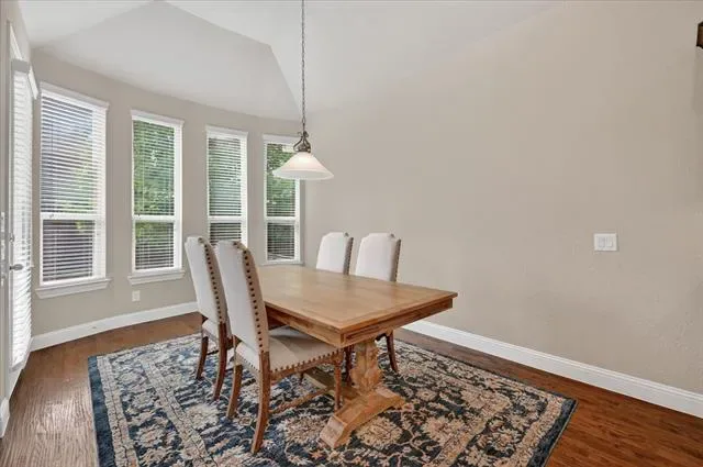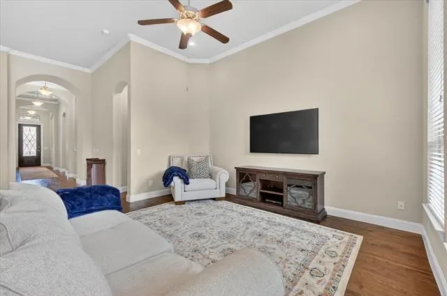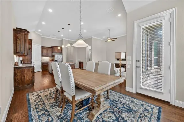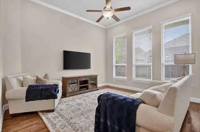 Step into a home where comfort, style, and ease come together beautifully. This 2-bedroom, 2.5-bath residence with a private study offers a light-filled, open layout enhanced by high ceilings and elegant arched entryways. Rich hand-scraped hardwood floors flow throughout the main living areas and study, creating a warm and inviting feel from the moment you enter. The spacious study, complete with French doors, ceiling fan, and generous storage, is perfect for a home office, hobbies, or welcoming guests. At the heart of the home, the chef’s kitchen features granite countertops, a gas cooktop, stainless steel appliances, a stylish tile backsplash, and a large island with breakfast bar seating—ideal for both everyday living and entertaining. The primary suite is a true retreat, offering a large sitting area, dual vanities with granite countertops, an oversized walk-in shower with dual shower heads, and a spacious walk-in closet. Outside, enjoy the covered patio perfect for morning coffee or relaxing evenings. Situated on a desirable corner lot tucked within the community, this home offers both privacy and connection. Additional features include a utility room with cabinetry and space for a freezer. New roof April 2026. The HOA provides front yard lawn care, giving you more time to enjoy life. Located in a vibrant 55+ active adult gated community, residents enjoy resort-style amenities including a pool, indoor fitness center, clubhouse with kitchen, and a full calendar of activities. With easy access to shopping, dining, and the greater Metroplex, this home offers the perfect balance of tranquility, convenience, and community. At least one resident must be 55 years of age or older.