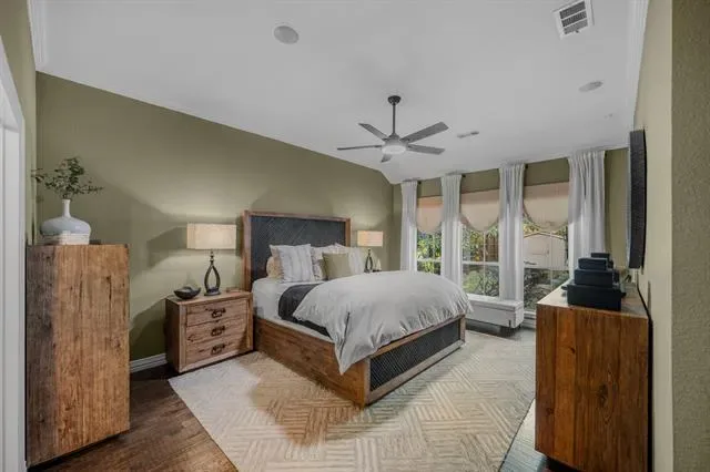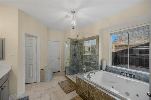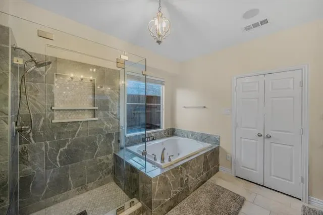The primary suite is a true sanctuary, featuring a tranquil sitting area, electric shades, and a spa-inspired bath complete with a jetted soaking tub, separate glass-enclosed shower, and spacious walk-in closet.