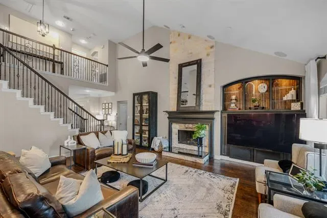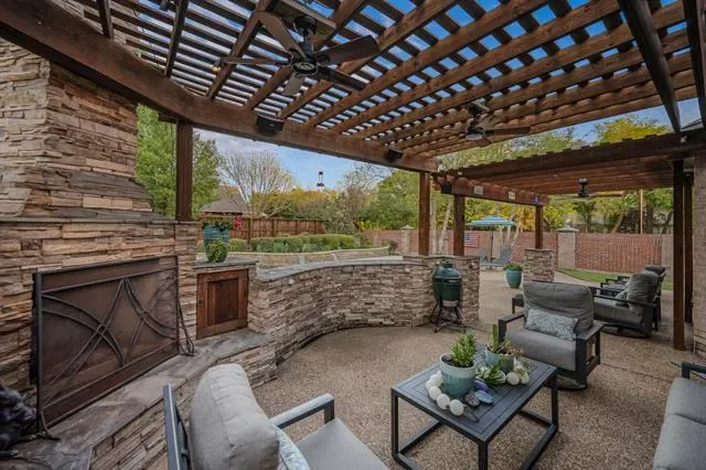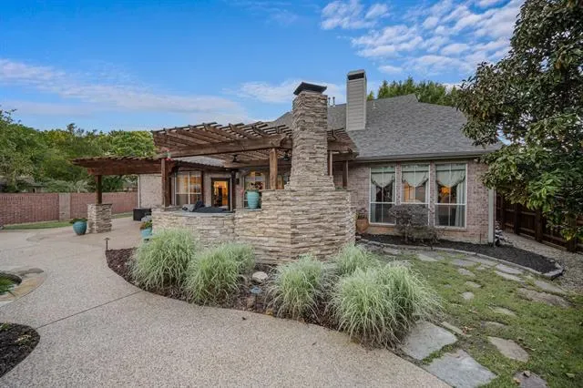 A dramatic wall of windows draws your eye to the home’s most captivating feature—an exceptional outdoor living experience designed for both intimate evenings and grand entertaining. Enjoy a resort-style backyard complete with a sparkling pool, arbor-covered patio, and a stunning stacked stone fireplace, all enveloped in privacy to create your own secluded oasis.