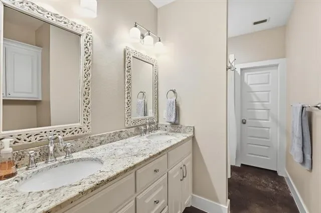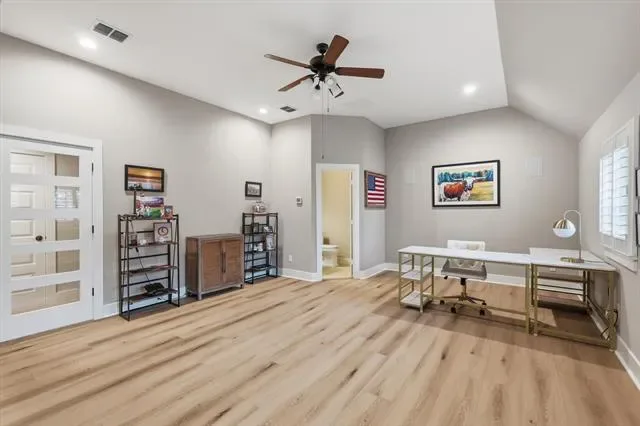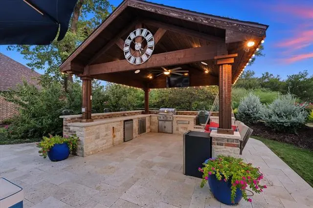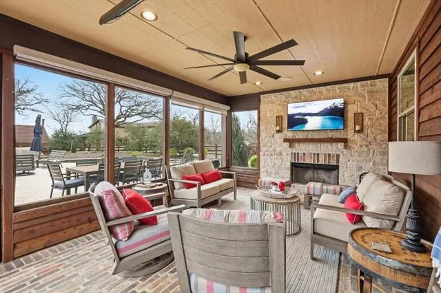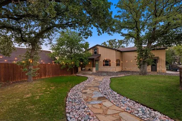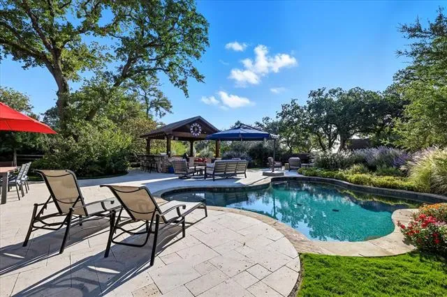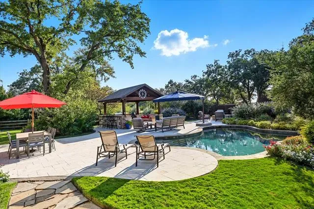 Discover this exemplary 1.5-story custom-built luxury home tucked away on a peaceful 2-acre lot in desirable Flower Mound. Spanning just over 3,100 sq. ft., the impressive main residence blends thoughtful design, comfort, and exceptional craftsmanship. A welcoming entry leads to a formal dining room that can also serve as a home office. The open-concept layout flows seamlessly into the gourmet kitchen featuring a 6-burner gas cooktop, dual ovens, under-cabinet lighting, farmhouse sink, large walk-in pantry, and a charming built-in hutch in the breakfast area for added prep space and storage. The inviting living room showcases cedar-beam vaulted ceilings, built-in cabinetry flanking a cozy gas fireplace, and a wall of windows that fill the space with natural light. The private primary suite is tucked at the back of the home and offers a tranquil ensuite bath with dual vanities, a soaking tub, large shower, and a spacious walk-in closet. Two secondary bedrooms each feature their own ensuite bath and walk-in closet. Upstairs, a versatile bonus room with a half bath is perfect for entertaining or easily used as a fourth bedroom. Step outside to your serene outdoor retreat featuring a 19×13 screened porch with a wood-burning fireplace, heaters, and surround sound speakers. Enjoy the covered pergola with a built-in Turbo grill, firepit, and a sparkling saltwater pool surrounded by lush landscaping and plenty of grassy space to play. The 39×25 workshop offers additional parking for up to four vehicles, RV or boat parking. Attached guest quarters include a living and dining area, kitchenette, bedroom, and half bath—ideal as a private guest suite, income-producing apartment, or man cave. Additional expansion potential awaits in the 40×26 floored attic space. With its exceptional craftsmanship, versatile spaces, and resort-style outdoor amenities, this one-of-a-kind property offers the perfect blend of luxury, comfort, and endless possibilities.