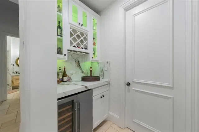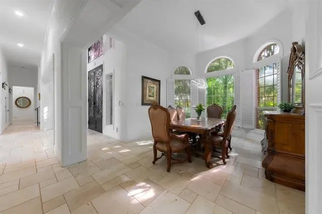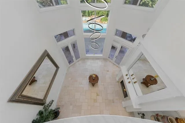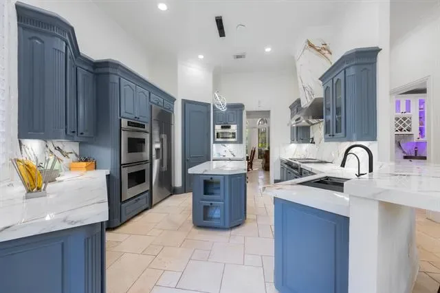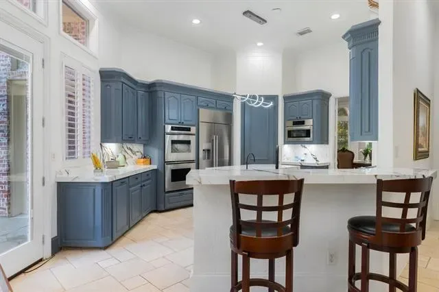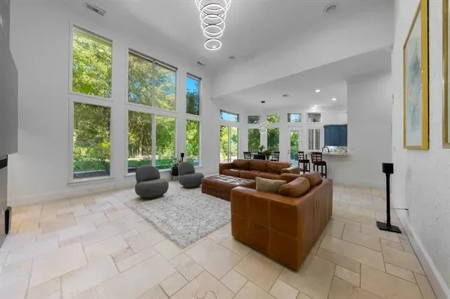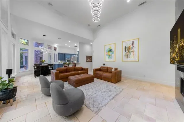 The home features 4 bedrooms and 5 bathrooms, with high ceilings (11’–24’) and abundant natural light throughout. The family room includes a modern fireplace and lighted shelving, while the formal living room has a gas fireplace with relaxing views of the pool. The kitchen is designed for both everyday living and entertaining, with Italian porcelain countertops, high-end appliances, and upgraded refrigerator and microwave. Two wet bars, one with a built-in wine fridge, add extra convenience.