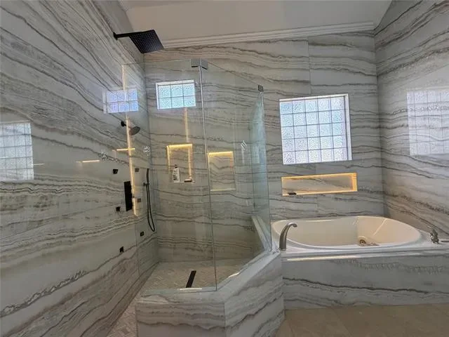 The primary suite overlooks the wooded backyard and features a spacious bathroom with quartz finishes, walk-in shower with rainfall and jets, jacuzzi tub, and a large custom walk-in closet with built-ins, drawers, and excellent lighting for easy organization.