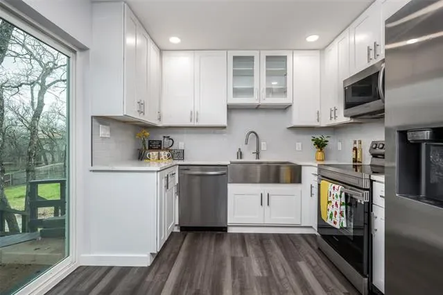 The kitchen was completely redesigned in 2024, featuring stainless steel appliances, Calacatta quartz countertops, custom cabinetry with soft-close drawers and doors, and a multifunctional farmhouse sink, making it ideal for both everyday living and entertaining.