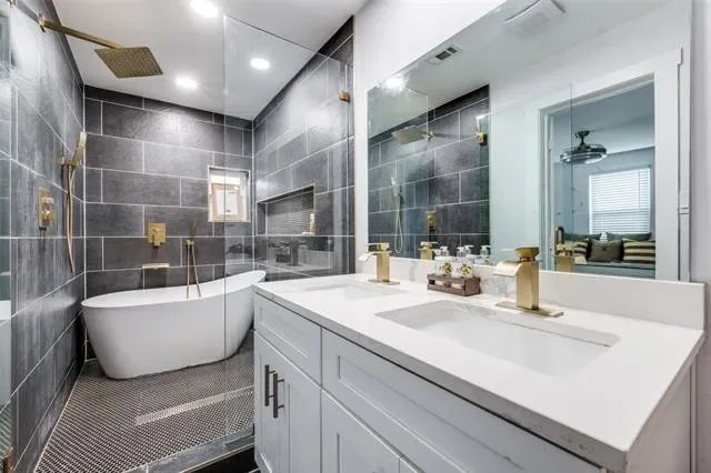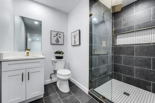 Both bathrooms were fully remodeled in 2024 with new flooring, designer tile, vanities, mirrors, fixtures, and showers. The primary bathroom features a distinctive enclosed soaking tub with elegant gold trim and handheld spray, creating a spa-inspired retreat.