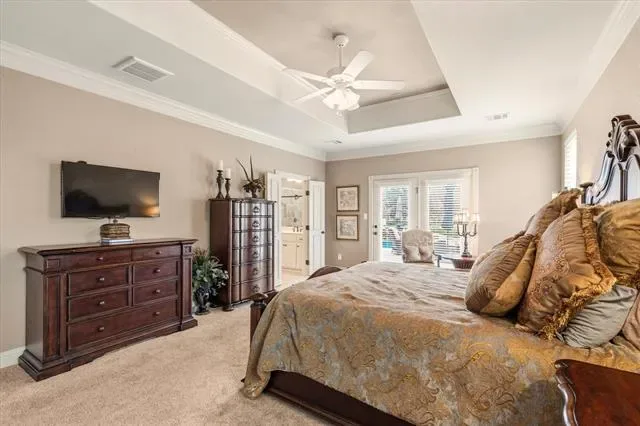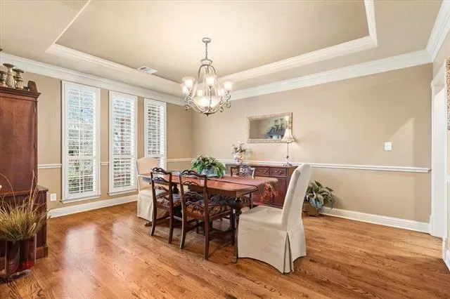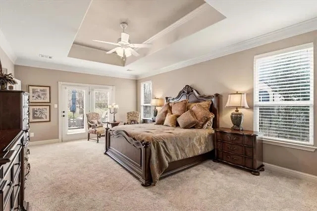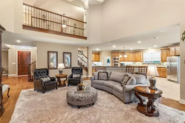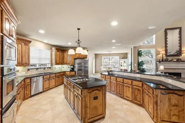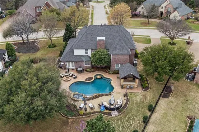 Step inside this breathtaking two-story traditional home with a pool, perfectly situated on a half-acre lot in the highly sought-after community of Sanctuary. A grand foyer with soaring 19-foot ceilings and sweeping hardwood floors welcomes you into this elegant yet functional home, where formal living and dining rooms are beautifully positioned off the entry. The home opens to an inviting entertainment space featuring a spacious family room with a cozy gas fireplace and large windows overlooking the serene outdoor oasis. The gourmet kitchen is a chef’s dream, complete with granite countertops, a gas cooktop, dual ovens, under-cabinet lighting, abundant prep space, and a large walk-in pantry. The serene primary suite is thoughtfully located on the main floor and offers dual walk-in closets along with a luxurious ensuite bath featuring separate vanities, a relaxing jetted tub, and a separate shower. A secondary bedroom with a walk-in closet and patio access is also on the main floor, making it ideal for a nursery or home office. A stunning wrought-iron split staircase leads to the second floor, where you’ll find a spacious game room, a media room with two-tiered seating, and three additional bedrooms—each with walk-in closets and private ensuite baths. Step outside to your backyard paradise with a firepit, where a sparkling heated saltwater pool with a tranquil waterfall feature and built-in table creates the perfect retreat. A covered pergola with a grill provides the ideal space for entertaining, while the expansive lawn offers plenty of room for kids and pets to play. Once you arrive, you may never want to leave.