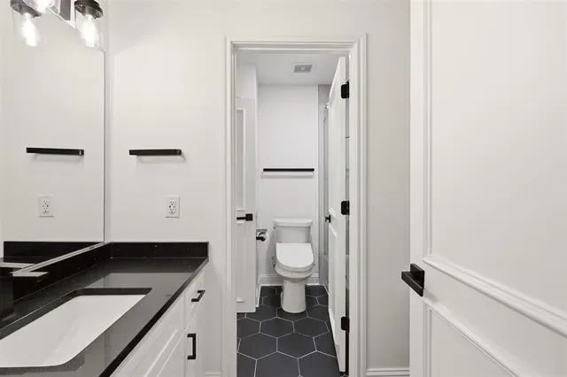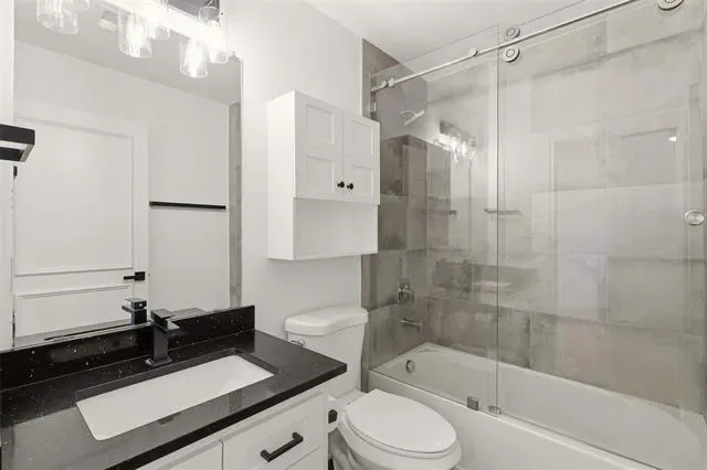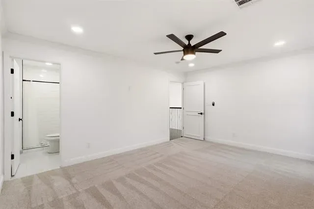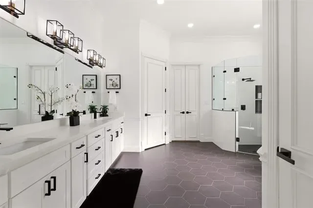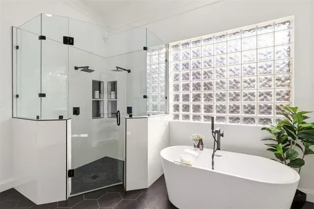 The luxurious primary suite offers a completely remodeled bathroom with frameless glass shower, freestanding soaking tub, and custom closet cabinetry, creating a true retreat.