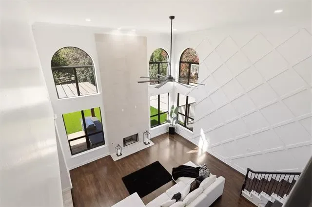 The interior showcases a smooth wall texture finish throughout the entire home, custom cabinetry, designer quartz countertops, updated lighting, and new flooring. The main living area features soaring 20+ foot ceilings and a dramatic floor-to-ceiling fireplace, creating an impressive focal point ideal for entertaining.