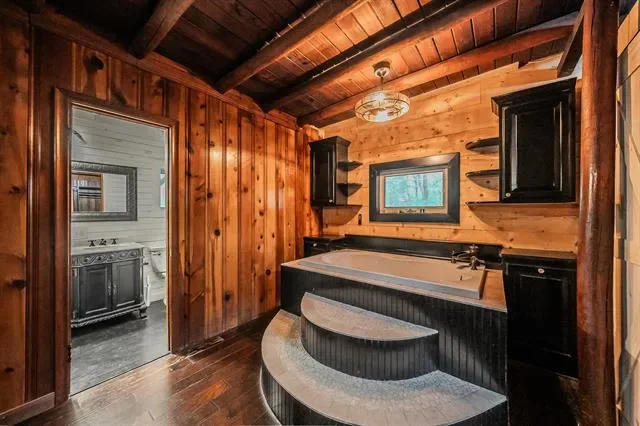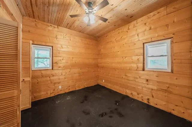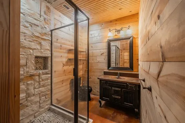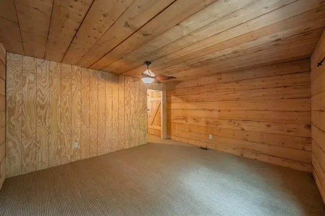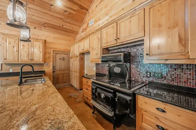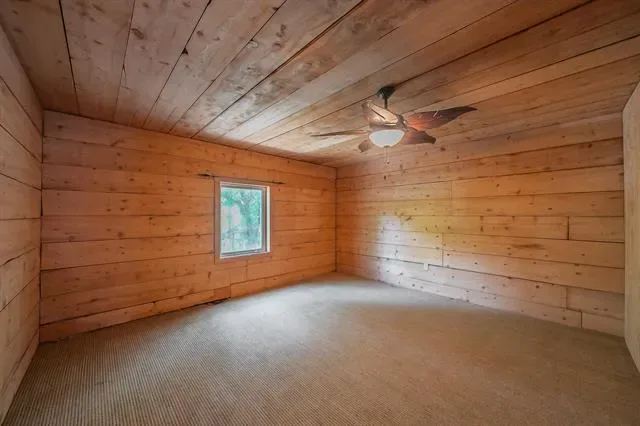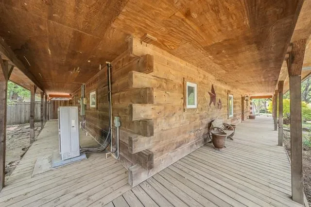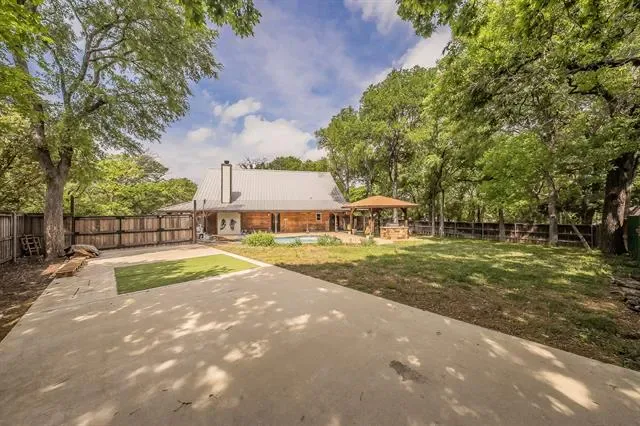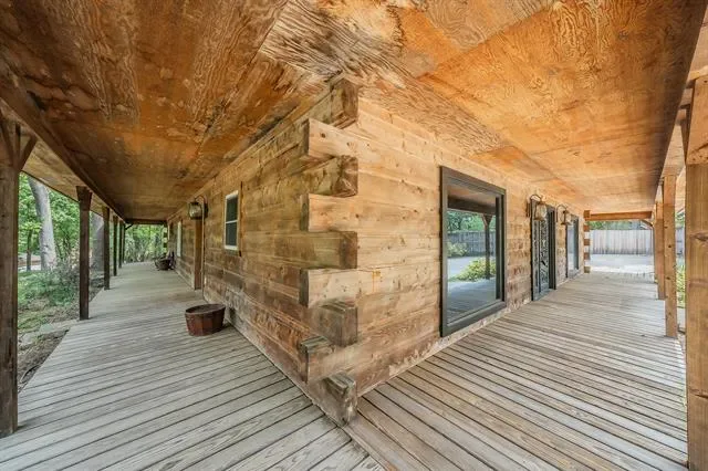 Stunning Lake-House Style Retreat Near Grapevine Lake. Discover this one-of-a-kind lake-house style home, just a short walk to Grapevine Lake and the Northshore Trails. This custom log cabin-inspired residence features a solid wood exterior and a durable metal roof, set on nearly half an acre of serene, private land. Step outside to your backyard oasis, complete with a sparkling pool, covered patio, built-in grill, and mature trees, perfect for entertaining or relaxing in nature. Enjoy the charm of a wrap-around porch and a wrought iron front door that warmly welcomes you inside.