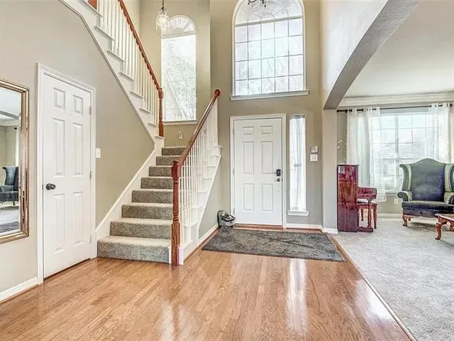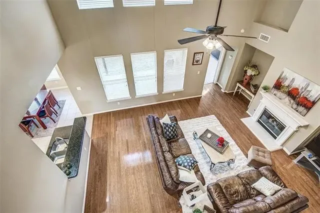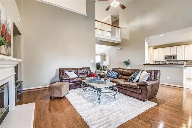 The home features an open and functional floor plan with abundant natural light, soaring ceilings, and spacious living areas. The main living room showcases hardwood flooring, a fireplace, and dramatic volume ceilings with an overlook from the second level, creating a bright and inviting central gathering space.