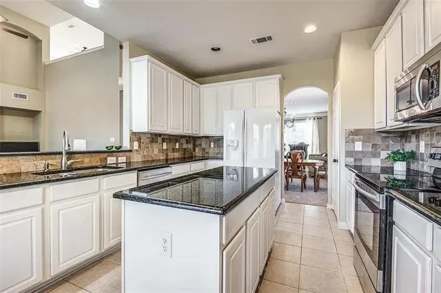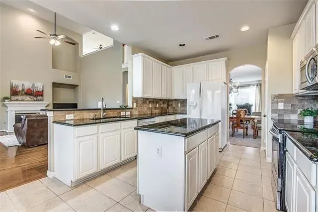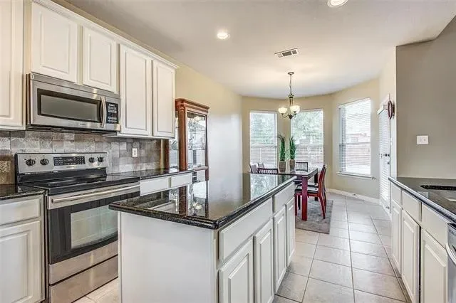 The kitchen is designed for both everyday living and entertaining, featuring granite countertops, a center island, ample cabinetry, and a breakfast nook with backyard views. Formal living and dining areas provide additional flexibility for entertaining.