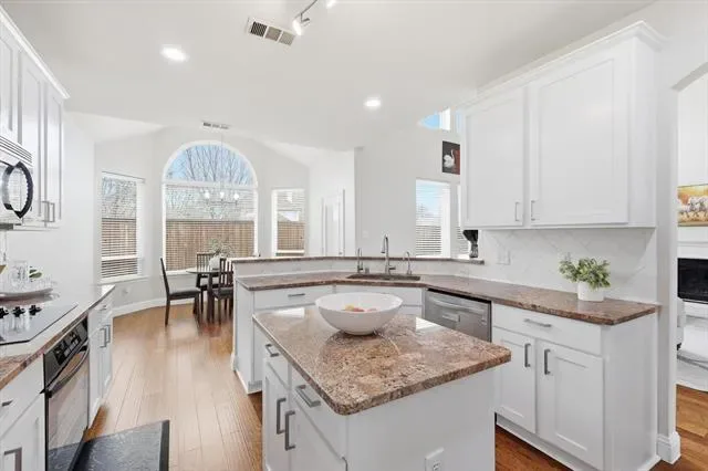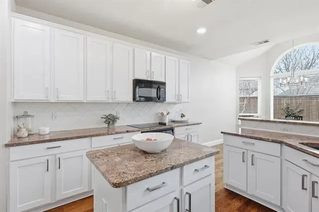 The main living area is filled with natural light and opens directly into a well-appointed kitchen designed for both everyday living and entertaining. Features include granite countertops, white cabinetry with updated shaker-style doors, a new cooktop, instant hot water, and a built-in water purification system.