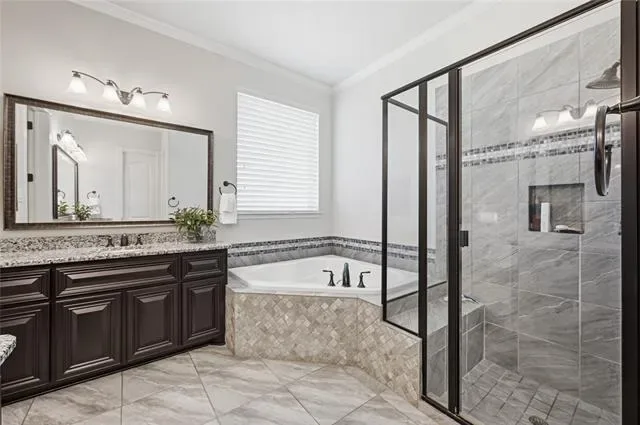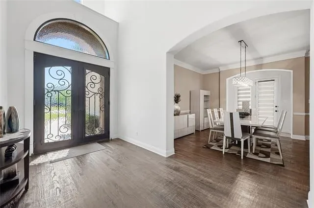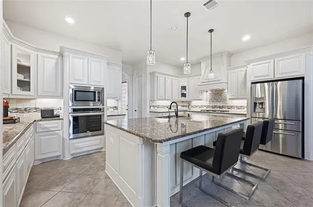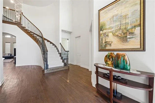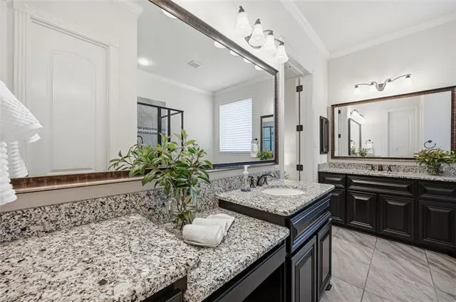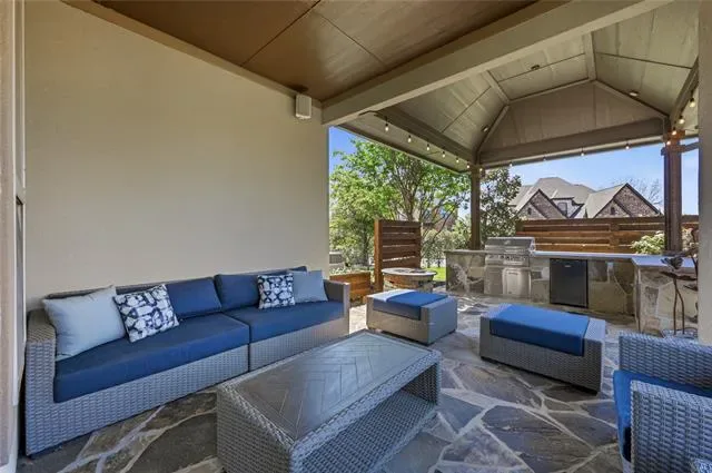 Experience the pinnacle of Mediterranean-inspired luxury in this gorgeous estate nestled on nearly half an acre within the prestigious Terracina community. A grand wrought iron double door entry welcomes you into a sophisticated interior defined by soaring ceilings, extensive hand-scraped wood flooring, recently installed carpet, and fresh paint. Architectural excellence shines through elegant crown molding, solid core doors, and accent art niches, while abundant windows bathe the open-concept floor plan in natural light. The heart of the home is an impressive family room anchored by a floor-to-ceiling stacked stone fireplace, overlooked by charming Juliet balconies. French doors lead to a private home office, providing a quiet retreat for productivity. Culinary enthusiasts will adore the modern kitchen featuring freshly painted cabinetry, granite countertops, a five-burner gas cooktop, and a center island with a breakfast bar. Thoughtful details like under-cabinet lighting, display cabinets, and a built-in wine rack elevate the space. Retreat to the lavish primary suite to find a tray ceiling, a cozy sitting area, and a spa-like bathroom with separate granite vanities, a jetted tub, and a massive custom closet system. A secondary bedroom and full bathroom are conveniently located downstairs, while the upper level hosts a game room and a high-tech media room equipped with a projector, screen, and built-in speakers. Ample storage throughout and a spacious three-car garage ensure practicality meets style. Transition outside to an expansive outdoor living center boasting a built-in kitchen and bar area, perfect for hosting summer gatherings overlooking the huge, lushly landscaped backyard. Located just moments from the premier dining and boutiques at The Shops at Highland Village and served by highly sought-after Flower Mound schools, this home offers an unparalleled lifestyle of convenience and class. Click the Virtual Tour link to see the 3D Tour!