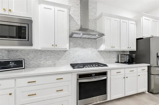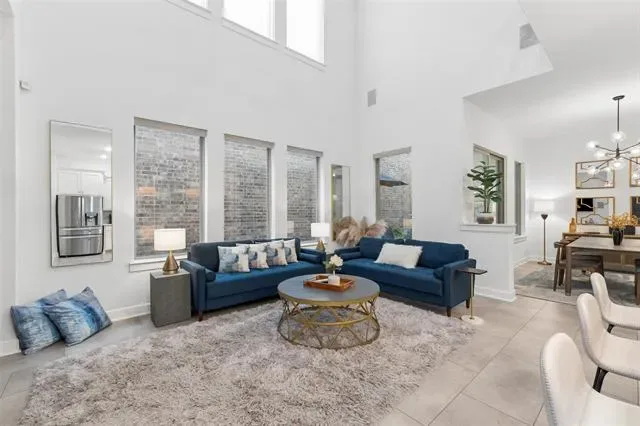The open-concept layout flows into a dramatic two-story great room filled with natural light, enhanced by automatic shades that provide both comfort and convenience. This impressive space is ideal for everyday living and entertaining. The kitchen serves as a true focal point, showcasing a large island, crisp white cabinetry, stainless steel appliances, and seamless connectivity to the dining and living areas.