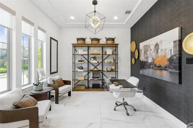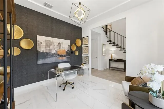 This stunning two-story home features 3 bedrooms, 2.1 baths, and 2,338 square feet of thoughtfully designed space. A dedicated office just off the entry creates a refined and functional work-from-home environment, complete with a bold accent wall and designer finishes that immediately set the tone.